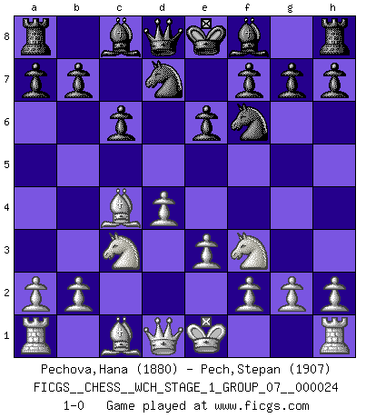 Last move : 1-0 2021 September 20 5:44:54 [Event "FICGS__CHESS__WCH_STAGE_1_GROUP_07__000024"] [Site "FICGS"] [Date "2021.07.11"] [Round "2"] [White "Pechova,Hana"] [Black "Pech,Stepan"] [Result "1-0"] [WhiteElo "1880"] [BlackElo "1907"] 1.d4 d5 2.c4 e6 3.Nc3 Nf6 4.Nf3 c6 5.e3 Nbd7 6.Bd3 dxc4 7.Bxc4 1-0 QGD Semi-Slav : 7.Bc4 Player White won this chess game. Follow this game move after move (download)A chess genius has died; a loss for humanity. (Viktor Kortchnoi, about Bobby Fischer's death) Aljechin war kein Nazi. Er war ein Opportunist. Ein schrecklicher Mann. Er liebte Geld über alles und würde für Geld ein Jude, ein Katolik oder ein Protestant werden. (Miguel Najdorf) El Ajedrez es 99 por ciento táctica. (Teichmann) La guerre est enfant de la passion, la passion est enfant du narcissisme et le narcissisme est l'enfant. (...) Une autre partie ? (Thibault de Vassal) The real voyage of discovery consists not in seeking new lands but in seeing with new eyes. (Marcel Proust)