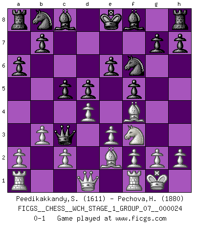 Last move : 0-1 2021 August 25 15:15:15 [Event "FICGS__CHESS__WCH_STAGE_1_GROUP_07__000024"] [Site "FICGS"] [Date "2021.07.11"] [Round "2"] [White "Peedikakkandy,Sameer"] [Black "Pechova,Hana"] [Result "0-1"] [WhiteElo "1611"] [BlackElo "1880"] 1.d4 f5 2.Nc3 Nf6 3.Bf4 d5 4.e3 e6 5.Nf3 a6 6.Be2 c5 7.b3 Qa5 8.O-O Qxc3 0-1 Dutch Kingside Castling by player White (move 8) Player Black won this chess game. Follow this game move after move (download)I have always a slight feeling of pity for the man who has no knowledge of Chess. (Siegbert Tarrasch) Ich habe Kasparov in Rente geschickt. (Veselin Topalov) Uno no tiene que jugar muy bien, es suficiente jugar mejor que el oponente. (Siegbert Tarrasch) Il (Jacob Murray) ne joue pas pour le bon coup, mais pour le meilleur. (Eloi Relange) Kids, you tried your best and you failed miserably. The lesson is, never try. (Simpsons)
