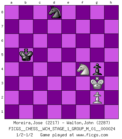Last move : 1/2-1/2 2021 August 25 21:43:11 [Event "FICGS__CHESS__WCH_STAGE_1_GROUP_M_01__000024"] [Site "FICGS"] [Date "2021.07.11"] [Round "1"] [White "Moreira,Jose"] [Black "Walton,John"] [Result "1/2-1/2"] [WhiteElo "2217"] [BlackElo "2287"] 1.d4 Nf6 2.c4 g6 3.Nc3 Bg7 4.e4 d6 5.h3 O-O 6.Be3 c5 7.Nf3 cxd4 8.Nxd4 Nc6 9.Be2 Nxd4 10.Bxd4 Bd7 11.O-O Bc6 12.Qc2 a5 13.b3 Bh6 14.Rad1 Nd7 15.Bg4 e6 16.f4 Qe7 17.f5 exf5 18.exf5 Be3+ 19.Kh1 Bxd4 20.Rxd4 Rae8 21.Qd2 Nf6 22.Bf3 Qe5 23.Rxd6 Qxf5 24.Rf2 Bxf3 25.Rxf3 Ne4 26.Rxf5 Nxd2 27.Rxa5 Re1+ 28.Kh2 Nf1+ 29.Kg1 Ne3 30.Kf2 Re8 31.Kxe1 Nxc4 32.Kd1 Nxd6 33.Kd2 Kf8 34.a4 Rd8 35.Rd5 Ke7 36.Rd3 f5 37.Ke3 Ke6 38.Nb5 g5 39.a5 f4+ 40.Kf3 Nf7 41.Rxd8 Nxd8 42.Na7 Kf5 43.b4 h5 44.Nc8 g4+ 45.Kf2 Ke6 46.b5 Kd5 47.Ne7+ Kc5 48.a6 bxa6 49.bxa6 Kb6 50.Nd5+ Kxa6 51.hxg4 hxg4 52.Nxf4 Kb5 53.Kg3 1/2-1/2 King's Indian : Makagonov system (5.h3) Kingside Castling by player Black (move 5) Kingside Castling by player White (move 11) 10 pieces endgame at move 49 : White KNPPP , Black KNPPP WHITE : King + 1 Knight 3 Pawns BLACK : King + 1 Knight 3 Pawns 9 pieces endgame at move 50 : White KNPP , Black KNPPP WHITE : King + 1 Knight 2 Pawns BLACK : King + 1 Knight 3 Pawns 8 pieces endgame at move 51 : White KNPP , Black KNPP WHITE : King + 1 Knight 2 Pawns BLACK : King + 1 Knight 2 Pawns 7 pieces endgame at move 51 : White KNP , Black KNPP WHITE : King + 1 Knight 1 Pawn BLACK : King + 1 Knight 2 Pawns 6 pieces endgame at move 52 : White KNP , Black KNP WHITE : King + 1 Knight 1 Pawn BLACK : King + 1 Knight 1 Pawn This chess game ended in a draw. Follow this game move after move (download)You can only get good at Chess if you love the game. (Bobby Fischer) Als ich elf wurde, wurde ich einfach gut. (Robert James Fischer) ¿Esta Bobby Fischer algo cuerdo?. (Salo Flohr) Comme les marins qui ont mille raisons différentes d'aller en mer, les joueurs d'échecs en ont tout autant avant de s'installer devant une table et jouer... (Vincent Bertignac, philosophe) You know what they say : You lie down with the Devil, you wake up in Hell. (Horatio Caine, C.S.I. Miami)