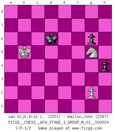 Last move : 1/2-1/2 2021 November 10 1:48:6 [Event "FICGS__CHESS__WCH_STAGE_1_GROUP_M_01__000024"] [Site "FICGS"] [Date "2021.07.11"] [Round "1"] [White "van Dijk,Erik L."] [Black "Walton,John"] [Result "1/2-1/2"] [WhiteElo "2201"] [BlackElo "2287"] 1.d4 Nf6 2.c4 g6 3.Nc3 Bg7 4.e4 d6 5.f3 O-O 6.Be3 c5 7.Nge2 Nc6 8.d5 Ne5 9.Ng3 h5 10.Be2 e6 11.Bg5 Qb6 12.Qb3 exd5 13.Qxb6 axb6 14.cxd5 Bd7 15.a4 Rfe8 16.h4 Ra5 17.Ra3 Rea8 18.Rb3 Bxa4 19.Rxb6 Nfd7 20.Rxb7 c4 21.O-O Nc5 22.Rb6 Ncd7 23.Rb4 Bc2 24.Be7 R5a6 25.f4 Ng4 26.Rxc4 Ne3 27.Rb4 Nxf1 28.Kxf1 Rb6 29.Rxb6 Nxb6 30.Bxd6 Bf6 31.Ke1 Na4 32.Kd2 Bb3 33.f5 Nxc3 34.bxc3 Rc8 35.fxg6 fxg6 36.Bd3 Bxc3+ 37.Ke3 Bf6 38.Ne2 Bxh4 39.Nd4 Bc4 40.Bxc4 Rxc4 41.Kd3 Ra4 42.Nc6 Kf7 43.e5 Ke8 44.e6 Ra1 45.Be5 Rd1+ 46.Kc4 Rc1+ 47.Kb5 Be7 48.d6 Bxd6 49.Bxd6 h4 50.Ne7 Re1 51.Nd5 Rxe6 52.Nc7+ Kd7 53.Nxe6 Kxd6 54.Ng5 1/2-1/2 King's Indian : Saemisch, 5...O-O Kingside Castling by player Black (move 5) Kingside Castling by player White (move 21) 10 pieces endgame at move 48 : White KBNPP , Black KRBPP WHITE : King + 1 Bishop 1 Knight 2 Pawns BLACK : King + 1 Rook 1 Bishop 2 Pawns 9 pieces endgame at move 49 : White KBNPP , Black KRPP WHITE : King + 1 Bishop 1 Knight 2 Pawns BLACK : King + 1 Rook 2 Pawns 8 pieces endgame at move 51 : White KBNP , Black KRPP WHITE : King + 1 Bishop 1 Knight 1 Pawn BLACK : King + 1 Rook 2 Pawns 7 pieces endgame at move 53 : White KBNP , Black KPP WHITE : King + 1 Bishop 1 Knight 1 Pawn BLACK : King + 2 Pawns 6 pieces endgame at move 53 : White KNP , Black KPP WHITE : King + 1 Knight 1 Pawn BLACK : King + 2 Pawns This chess game ended in a draw. Follow this game move after move (download)Fischer is under obligation to nobody. (Joseph Platz) Ein bischen Romantik kann weder im Schach noch in der Liebe schaden. Also versuche ich mich ab und zu daran zu erinnern. (Nigel Short) Yo nunca en mi vida he jugado la Defensa Francesa, que viene siendo la más aburrida de todas las Aperturas. (Wilhelm Steinitz) Mon pion favori sur ma case favorite ! Bronstein en parlant d'un coup de pion en h5 quand il avait les Noirs. I find television to be very educating. Every time somebody turns on the set, I go in the other room and read a book. (Groucho Marx)
