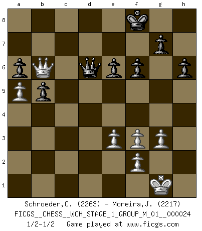 Last move : 1/2-1/2 2021 July 18 12:58:39 [Event "FICGS__CHESS__WCH_STAGE_1_GROUP_M_01__000024"] [Site "FICGS"] [Date "2021.07.11"] [Round "1"] [White "Schroeder,Christoph"] [Black "Moreira,Jose"] [Result "1/2-1/2"] [WhiteElo "2263"] [BlackElo "2217"] 1.d4 Nf6 2.Bf4 d5 3.e3 e6 4.Nf3 Bd6 5.Bg3 O-O 6.Nbd2 c5 7.c3 Qc7 8.Bd3 Nbd7 9.c4 Bxg3 10.hxg3 dxc4 11.Nxc4 h6 12.O-O b6 13.Rc1 Bb7 14.Ncd2 Qd6 15.Qa4 Rfd8 16.Qa3 Rac8 17.Rfd1 Qb8 18.b4 cxb4 19.Qxb4 Rxc1 20.Rxc1 Rc8 21.Rxc8+ Qxc8 22.Nc4 Be4 23.Bf1 Bd5 24.Nfe5 Nxe5 25.Nxe5 Nd7 26.Nf3 a6 27.a4 Bc6 28.Qc3 Qa8 29.a5 b5 30.Ne1 Qc8 31.Nd3 Bb7 32.Qb4 Be4 33.Nc5 Bd5 34.Be2 Nxc5 35.dxc5 f6 36.Bf3 Bxf3 37.gxf3 Qc6 38.Qd4 Kf7 39.Qd8 Qxc5 40.Qa8 Qd6 41.Qb7+ Kf8 42.Qb6 Ke7 43.Qb7+ Kf8 44.Qb6 Ke7 45.Qb7+ Kf8 46.Qb6 1/2-1/2 Queen's pawn game Kingside Castling by player Black (move 5) Kingside Castling by player White (move 12) This chess game ended in a draw. Follow this game move after move (download)A bad plan is better than none at all. (Frank Marshall) Was ist der Unterschied zwischen einem Strassenarbeiter und einem Schachspieler? --Der Schachspieler bewegt sich ab und zu. (Anonymous) El Ajedrez por encima de todo... ¡es una pelea!. (Emanuel Lasker) Les Echecs sont affaire de jugement sensible. Savoir quand frapper et quand esquiver. (Fischer) If things go wrong, don't go with them. (Roger Babson)
