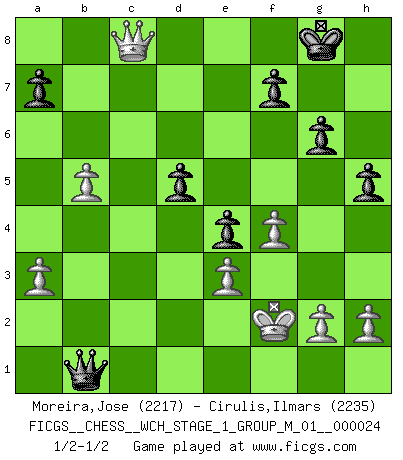 Last move : 1/2-1/2 2021 September 6 22:3:21 [Event "FICGS__CHESS__WCH_STAGE_1_GROUP_M_01__000024"] [Site "FICGS"] [Date "2021.07.11"] [Round "1"] [White "Moreira,Jose"] [Black "Cirulis,Ilmars"] [Result "1/2-1/2"] [WhiteElo "2217"] [BlackElo "2235"] 1.d4 Nf6 2.c4 e6 3.Nc3 Bb4 4.Qc2 O-O 5.a3 Bxc3+ 6.Qxc3 b6 7.Bg5 h6 8.Bh4 Bb7 9.e3 d6 10.f3 Nbd7 11.Bd3 e5 12.Bc2 e4 13.f4 b5 14.cxb5 Qe8 15.Bxf6 Nxf6 16.Ba4 Nd5 17.Qd2 Rb8 18.b3 Bc8 19.Ne2 Bd7 20.Nc3 Nxc3 21.Qxc3 Bxb5 22.Bxb5 Qxb5 23.Rb1 c5 24.Kf2 Rfc8 25.Rhd1 d5 26.dxc5 Rxc5 27.Qd2 Rbc8 28.Rdc1 g6 29.b4 Rxc1 30.Rxc1 Rxc1 31.Qxc1 Qd3 32.Qb2 Qd1 33.Qc3 h5 34.b5 Qb1 35.Qc8+ Kg7 36.Qc3+ Kg8 37.Qc8+ 1/2-1/2 Nimzo-Indian : Classical variation Kingside Castling by player Black (move 4) This chess game ended in a draw. Follow this game move after move (download)I have never in my life played the French Defence, which is the dullest of all openings. (Wilhelm Steinitz) Das typische an einem Großmeister ist, daß er eine gewonnene Position schnell und schmerzlos gewinnt. (Irving Chernev) Los Peones son nacidos libres, y aún así, se encuentran encadenados por todos lados. (Rick Kennedy) A chaque perte on perd un peu de soi. (Joël Lautier) I know the human being and fish can coexist peacefully. (George W. Bush, Saginaw sept. 29, 2000)