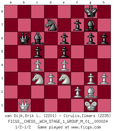 Last move : 1/2-1/2 2021 October 17 16:49:49 [Event "FICGS__CHESS__WCH_STAGE_1_GROUP_M_01__000024"] [Site "FICGS"] [Date "2021.07.11"] [Round "1"] [White "van Dijk,Erik L."] [Black "Cirulis,Ilmars"] [Result "1/2-1/2"] [WhiteElo "2201"] [BlackElo "2235"] 1.e4 c5 2.Nc3 Nc6 3.g3 g6 4.Bg2 Bg7 5.d3 d6 6.Be3 Nf6 7.h3 Rb8 8.Nge2 O-O 9.Qd2 b5 10.a3 a5 11.O-O b4 12.axb4 axb4 13.Nd1 Qb6 14.Bg5 Ba6 15.Ne3 e6 16.Ra2 Nd7 17.Rfa1 Bb5 18.c4 bxc3 19.bxc3 h6 20.Bf4 Nce5 21.Bxe5 dxe5 22.c4 Bc6 23.Nc3 Ra8 24.Rxa8 Rxa8 25.Rxa8+ Bxa8 26.Qa2 Bc6 27.Qb1 1/2-1/2 Sicilian : Closed, 6.Be3 Kingside Castling by player Black (move 8) Kingside Castling by player White (move 11) This chess game ended in a draw. Follow this game move after move (download)Daring ideas are like Chess men moved forward. They may be beaten, but they may start a winning game. (Johann Wolfgang von Goethe) Nur ein wirklich starker Spieler weiß wie schwach er spielt. (Savielly Grigorievitsch Tartakower) El Ajedrez es parte de la cultura, y si una cultura esta en decadencia, entonces también el Ajedrez declinará. (Mikhail Botvinnik) Je ne suis pas le dernier à jouer lâchement des coups douteux pendant le zeïtnot de l'adversaire pour l'achever: en effet les coups qui font le plus peur sont ceux que l'on ne comprend pas. Je me fais souvent peur quand je joue. (Un professeur anonyme) Chess, like love, like music, has the power to make people happy. (Siegbert Tarrasch)