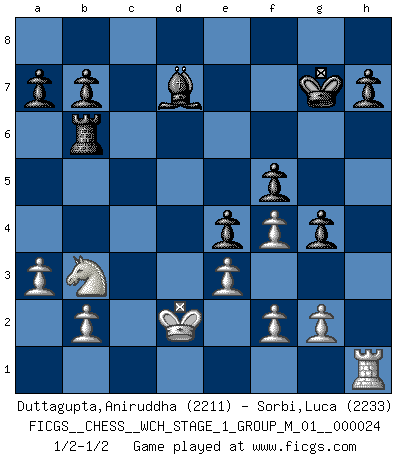 Last move : 1/2-1/2 2021 September 17 19:57:41 [Event "FICGS__CHESS__WCH_STAGE_1_GROUP_M_01__000024"] [Site "FICGS"] [Date "2021.07.11"] [Round "1"] [White "Duttagupta,Aniruddha"] [Black "Sorbi,Luca"] [Result "1/2-1/2"] [WhiteElo "2211"] [BlackElo "2233"] 1.d4 Nf6 2.Nf3 d5 3.Bf4 c5 4.e3 Nc6 5.Nbd2 e6 6.c3 Nh5 7.Bg5 f6 8.Bh4 g6 9.Be2 cxd4 10.cxd4 Be7 11.Rc1 O-O 12.Nb3 g5 13.Bg3 Nxg3 14.hxg3 Bd6 15.a3 Qe7 16.Nc5 g4 17.Ng1 f5 18.Qd2 e5 19.dxe5 Nxe5 20.Nb3 Bd7 21.Bd3 Nxd3+ 22.Qxd3 Qe4 23.Qxe4 dxe4 24.Ne2 Rac8 25.Rd1 Rf6 26.Rd5 Rc2 27.Rd2 Rxd2 28.Kxd2 Kg7 29.Nf4 Bxf4 30.gxf4 Rb6 1/2-1/2 Queen's pawn game Kingside Castling by player Black (move 11) This chess game ended in a draw. Follow this game move after move (download)Adequate compensation for a sacrifice is having a sound combination leading to a winning position; adequate compensation for a blunder is having your opponent snatch defeat from the jaws of victory. (Bruce A. Moon) Über die Verhaftung Bobby Fischers: Warum es die Bush-Administration für nötig befindet einen 61 Jahre alten Mann zu hetzten, der für niemanden ausser sich selbste eine Gefahr darstellt ist ein Rätsel. (Nigel Short) Los Peones son nacidos libres, y aún así, se encuentran por doquier encadenados. (Rick Kennedy) Les pièces de l'échiquier étaient impitoyables. Elles le retenaient, elles l'absorbaient. Il y avait de l'horreur en cela, mais aussi une harmonie unique. Car, qu'y a-t-il dans le monde, à part les échecs ? (V. Nabokov) If everyone is thinking alike, then somebody isn't thinking. (US General George S. Patton)