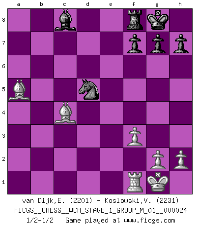 Last move : 1/2-1/2 2021 September 24 18:37:48 [Event "FICGS__CHESS__WCH_STAGE_1_GROUP_M_01__000024"] [Site "FICGS"] [Date "2021.07.11"] [Round "1"] [White "van Dijk,Erik L."] [Black "Koslowski,Volker"] [Result "1/2-1/2"] [WhiteElo "2201"] [BlackElo "2231"] 1.d4 Nf6 2.c4 e6 3.Nc3 Bb4 4.f3 d5 5.a3 Bxc3+ 6.bxc3 dxc4 7.e4 b5 8.a4 c6 9.Ba3 Nfd7 10.Ne2 Nb6 11.Nf4 a5 12.axb5 cxb5 13.Be2 Nc6 14.d5 exd5 15.exd5 Ne7 16.Qd4 b4 17.cxb4 axb4 18.Bxb4 Rxa1+ 19.Qxa1 O-O 20.O-O Re8 21.Qa5 Nbxd5 22.Qxd8 Rxd8 23.Nxd5 Nxd5 24.Ba5 Rf8 25.Bxc4 1/2-1/2 Nimzo-Indian : Kmoch variation Kingside Castling by player Black (move 19) Kingside Castling by player White (move 20) This chess game ended in a draw. Follow this game move after move (download)Chess is above all, a fight ! (Emanuel Lasker) Ein Kibitz ist einer, der deinem Gegner gute Ratschläge gibt. (Andrew Soltis) Aquellos que dicen que entienden al Ajedrez, no entienden nada. (Robert Hubner) Ce qui caractérise les parties de combat, c'est que si le défenseur a constamment de difficiles problèmes à résoudre, l'attaquant doit chercher sans relâche de nouvelles possibilités d'attaque. (Koblentz) The various flowers seem good to different people. (Chinese proverb)