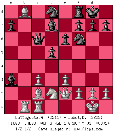 Last move : 1/2-1/2 2021 October 10 19:34:33 [Event "FICGS__CHESS__WCH_STAGE_1_GROUP_M_01__000024"] [Site "FICGS"] [Date "2021.07.11"] [Round "1"] [White "Duttagupta,Aniruddha"] [Black "Jabot,Daniel"] [Result "1/2-1/2"] [WhiteElo "2211"] [BlackElo "2225"] 1.d4 Nf6 2.Nf3 d5 3.Bf4 c5 4.e3 Nc6 5.Nbd2 Qb6 6.dxc5 Qxb2 7.Rb1 Qc3 8.Bb5 e6 9.O-O Be7 10.Nd4 Bd7 11.N2b3 O-O 12.Bd3 Qb4 13.c3 Qa4 14.a3 Nd8 15.Qe2 Rc8 16.Rfc1 b6 17.Bc2 Qc4 18.Bd3 Qa4 19.Nd2 bxc5 20.Bc2 Qxa3 21.N4b3 Qa4 22.Nxc5 Qc6 23.Na6 Ba3 24.Nb8 Rxb8 25.Bxb8 1/2-1/2 Queen's pawn game Kingside Castling by player White (move 9) Kingside Castling by player Black (move 11) This chess game ended in a draw. Follow this game move after move (download)Chess is a more highly symbolic game, but the aggressions are therefore even more frankly represented in the play. It probably began as a war game; that is, the representation of a miniature battle between the forces of two kingdoms. (Karl Meninger) Den Ruhm habe ich schon, jetzt brauche ich noch das Geld. (Wilhelm Steinitz) El juego del Ajedrez no es solamente una diversión quieta; algunas cualidades muy valuables de la mente se pueden adquirir y cultivar con el, como convertirlos en habitos disponibles para toda ocasión; ya que la vida es algo así como el Ajedrez. (Benjamin Franklin) Je fais ceci parce que dans cinquante coups j'obtiendrai cela; je m'appelle Mikhail Moisevitch Botvinnik. (Botvinnik) The right perception of any matter and a misunderstanding of the same matter do not wholly exclude each other. (Kafka's the trial)