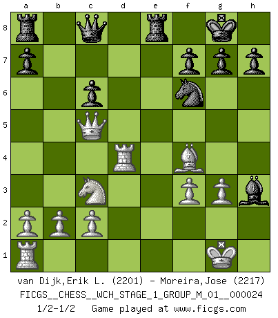Last move : 1/2-1/2 2021 September 6 3:37:52 [Event "FICGS__CHESS__WCH_STAGE_1_GROUP_M_01__000024"] [Site "FICGS"] [Date "2021.07.11"] [Round "1"] [White "van Dijk,Erik L."] [Black "Moreira,Jose"] [Result "1/2-1/2"] [WhiteElo "2201"] [BlackElo "2217"] 1.e4 e5 2.Nc3 Nf6 3.g3 Bc5 4.Bg2 O-O 5.Nge2 c6 6.O-O d5 7.exd5 cxd5 8.d4 exd4 9.Nxd4 Bg4 10.Qd3 Bxd4 11.Qxd4 Nc6 12.Qc5 d4 13.h3 Be6 14.Bxc6 Bxh3 15.Rd1 Qc8 16.Rxd4 bxc6 17.Bf4 Re8 18.f3 Nd7 19.Qh5 Nf6 20.Qc5 Nd7 21.Qh5 Nf6 22.Qc5 1/2-1/2 Vienna : Paulsen-Mieses variation Kingside Castling by player Black (move 4) Kingside Castling by player White (move 6) This chess game ended in a draw. Follow this game move after move (download)Dazzling combinations are for the many, shifting wood is for the few. (Georg Kieninger) Wer nie einen Fehler gemacht hat, hat nie etwas Neues ausprobiert. (Albert Einstein) Aquel que ve no otra dirección en el juego que la de dar Jaque Mate a su oponente, nunca será un buen jugador de Ajedrez. (Euwe) C'est une question de caractère, Beaucoup de gens perdent leur motivation très vite. D'autres, ils sont rares, peuvent la conserver très longtemps. J'aime les échecs, encore aujourd'hui je suis heureux d'analyser des parties. J'aime toujours gagner, je déteste encore perdre. Bien jouer est important pour mon intégrité intellectuelle et morale. Et puis les échecs vivent en ce moment une période historique grâce à Internet. Ils se développent dans les systèmes éducatifs à travers le monde. Ils sortent de leur ghetto, et c'est mon rôle de mener à bien cette révolution. (Gary Kasparov) There's no money in correspondence chess. (John Knudsen)