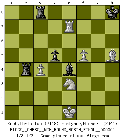 Last move : 1/2-1/2 2007 September 6 0:51:46 [Event "FICGS__CHESS__WCH_ROUND_ROBIN_FINAL__000001"] [Site "FICGS"] [Date "2007.07.14"] [Round "1"] [White "Koch,Christian"] [Black "Aigner,Michael"] [Result "1/2-1/2"] [WhiteElo "2118"] [BlackElo "2441"] 1.e4 c5 2.Nf3 Nc6 3.d4 cxd4 4.Nxd4 Nf6 5.Nc3 e5 6.Ndb5 d6 7.Bg5 a6 8.Na3 b5 9.Nd5 Be7 10.Bxf6 Bxf6 11.c3 O-O 12.Nc2 Bg5 13.a4 bxa4 14.Rxa4 a5 15.Bc4 Rb8 16.b3 Kh8 17.Nce3 g6 18.h4 Bxh4 19.g3 Bg5 20.f4 exf4 21.gxf4 Bh4+ 22.Kd2 Ne7 23.Qg1 Nxd5 24.Nxd5 Bf6 25.Qa7 Bg4 26.Qxa5 Bf3 27.Re1 Bh4 28.Re3 Bg4 29.Qxd8 Rfxd8 30.b4 h5 31.Rd3 Rdc8 32.Ne3 Bg3 33.f5 Bf3 34.Bxf7 Bxe4 35.Bxg6 Be1+ 36.Kxe1 Bxd3 37.Ra7 Be4 38.Re7 d5 39.c4 Rxb4 40.Bxh5 1/2-1/2 Sicilian : Pelikan (Lasker/Sveshnikov) variation Kingside Castling by player Black (move 11) This chess game ended in a draw. Follow this game move after move (download)Discovered check is the dive bomber of the Chessboard. (Reuben Fine) Obwohl ich alt bin, darf mir niemand den Finger in den Mund stecken, sonst beisse ich. (Wilhelm Steinitz) Aquel que toma al Peón de Caballo de la Reina, se pasará la noche a dormir en la calle. (Anónimo) Les Cavaliers se révèlent fort utiles dans les positions fermées. D'habitude, les Fous sont un peu plus forts que les Cavaliers dans les positions ouvertes. Qu'on le veuille ou non, il restera toujours des exceptions ! A good book on your shelf is a friend that turns its back on you and remains a friend. (Author unknown)