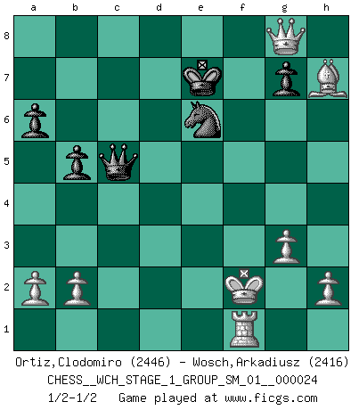 Last move : 1/2-1/2 2021 September 2 14:58:5 [Event "FICGS__CHESS__WCH_STAGE_1_GROUP_SM_01__000024"] [Site "FICGS"] [Date "2021.07.11"] [Round "1"] [White "Ortiz,Clodomiro"] [Black "Wosch,Arkadiusz"] [Result "1/2-1/2"] [WhiteElo "2446"] [BlackElo "2416"] 1.d4 Nf6 2.c4 e6 3.Nc3 Bb4 4.e3 O-O 5.Nf3 d5 6.Bd3 c5 7.cxd5 exd5 8.dxc5 Nbd7 9.Bd2 Nxc5 10.Be2 Ne6 11.O-O a6 12.Rc1 Bd6 13.Bd3 Re8 14.Ne2 Ne4 15.Bc3 b5 16.Be5 N4g5 17.Nxg5 Bxe5 18.Bxh7+ Kf8 19.Nxf7 Kxf7 20.Ng3 Bxg3 21.fxg3 Ke7 22.Qh5 Qb6 23.Kh1 Rf8 24.Rxf8 Nxf8 25.Qxd5 Ne6 26.Qxa8 Bb7 27.Qg8 Qxe3 28.Rf1 Bxg2+ 29.Kxg2 Qd2+ 30.Kf3 Qd5+ 31.Kf2 Qc5+ 32.Kg2 Qd5+ 33.Kf2 Qc5+ 1/2-1/2 Nimzo-Indian : 4.e3, Main line with ...c5 Kingside Castling by player Black (move 4) Kingside Castling by player White (move 11) This chess game ended in a draw. Follow this game move after move (download)Chess is like life. (Boris Spassky) Karpov ist ein Museumsstück. (Garry Kasparov) Las piezas de Ajedrez son los bloques del alfabeto que moldean los pensamientos; y esos pensamientos, aunque hagan un diseño visual en el tablero, expresan abstractamente su belleza como un poema. (Marcel Duchamp) Les échecs, c'est la lutte contre l'erreur. (Johannes Zukertort) Thibault, I ask for draw. Game 13876. - Sorry Ilmars, you won. (FICGS chat)