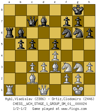 Last move : 1/2-1/2 2021 August 23 12:26:41 [Event "FICGS__CHESS__WCH_STAGE_1_GROUP_SM_01__000024"] [Site "FICGS"] [Date "2021.07.11"] [Round "1"] [White "Hybl,Vladislav"] [Black "Ortiz,Clodomiro"] [Result "1/2-1/2"] [WhiteElo "2386"] [BlackElo "2446"] 1.e4 e5 2.Nf3 Nc6 3.Bb5 Nf6 4.d3 Bc5 5.c3 O-O 6.O-O d6 7.h3 a6 8.Ba4 b5 9.Bc2 Bb6 10.Nbd2 Bd7 11.Re1 Ne7 12.Nf1 h6 13.Ng3 Ng6 14.a4 Rc8 15.b4 c5 16.axb5 axb5 17.bxc5 dxc5 18.Be3 Qc7 19.Qd2 Rfe8 20.Reb1 Ra8 21.Rxa8 Rxa8 22.Qd1 Ra6 23.Ra1 1/2-1/2 Ruy Lopez : Berlin defense Kingside Castling by player Black (move 5) Kingside Castling by player White (move 6) This chess game ended in a draw. Follow this game move after move (download)When you don't know what to play, wait for an idea to come into your opponent's mind. You may be sure that idea will be wrong. (Siegbert Tarrasch) Ich hatte Angst gegen einen russischen Großmeister zu verlieren, und er befürchtete gegen einen kleinen Jungen zu verlieren. (über ein Remis gegen Juri Awerbach). (Robert James Fischer) Hasta este punto, las blancas han seguido un análisis bien conocido. Pero ahora el hace un error fatal: empieza a usar su propia cabeza. (Siegbert Tarrasch) Pour moi, les échecs ne sont pas un jeu mais un art. (Alexandre Alekhine) Don't be discouraged. It's often the last key in the bunch that opens the lock. (Author unknown)