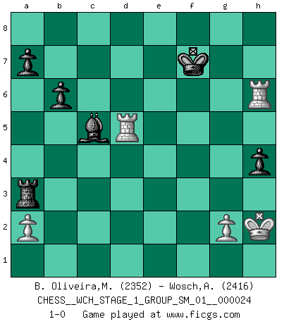 Last move : 1-0 2021 December 11 18:41:18 [Event "FICGS__CHESS__WCH_STAGE_1_GROUP_SM_01__000024"] [Site "FICGS"] [Date "2021.07.11"] [Round "1"] [White "B. Oliveira,Marcio"] [Black "Wosch,Arkadiusz"] [Result "1-0"] [WhiteElo "2352"] [BlackElo "2416"] 1.e4 c5 2.Nf3 Nc6 3.Bb5 g6 4.O-O Bg7 5.c3 Nf6 6.Re1 O-O 7.d4 cxd4 8.cxd4 d5 9.e5 Ne4 10.Nc3 Bf5 11.Bd3 Nxc3 12.bxc3 Qd7 13.Ng5 Bxd3 14.Qxd3 e6 15.h4 h6 16.Nf3 Ne7 17.h5 Rac8 18.hxg6 fxg6 19.Ba3 g5 20.Nd2 Rc6 21.c4 Rfc8 22.Bxe7 dxc4 23.Qa3 Ra6 24.Qb4 Rb6 25.Qc3 Qxe7 26.Ne4 Rbc6 27.Rab1 b6 28.Qc2 Rf8 29.Re3 Qd7 30.Nd6 Rxd6 31.exd6 Qxd6 32.Qxc4 Bxd4 33.Rxe6 Bxf2+ 34.Kh1 Qf4 35.Re4 Qf7 36.Qe2 Bc5 37.Re6 h5 38.Rd1 g4 39.Qc4 g3 40.Rg6+ Kh7 41.Qxf7+ Rxf7 42.Rxg3 Rf4 43.Rd5 Kh6 44.Rh3 h4 45.Rf3 Rc4 46.Rd2 Ra4 47.Kh2 Be7 48.Re3 Bc5 49.Re5 Ra3 50.R2d5 Kg7 51.Re6 Kf7 52.Rh6 1-0 Sicilian : Nimzovich-Rossolimo attack (with ...g6, without ...d6) Kingside Castling by player White (move 4) Kingside Castling by player Black (move 6) Player White won this chess game. Follow this game move after move (download)When the Chess game is over, the Pawn and the King go back to the same box. (Irish saying) Frage: Gibt es etwas was Sie mehr lieben als Autobahnen ohne Tempobegrenzungen? - Antwort: Deutsche Frauen ohne Tempobegrenzungen. (Loek van Wely) Personalmente, yo prefiero mirar hacia el futuro en donde un programa de computadora gane el título mundial de Ajedrez. La humanidad necesita una lección de humildad. (Richard Dawkings) Les Echecs mettent en conflit, non pas deux intelligences, mais deux volontés. (Lasker) The leaves of memory seemed to make a mournful rustling in the dark. (Henry Wadsworth Longfellow)
