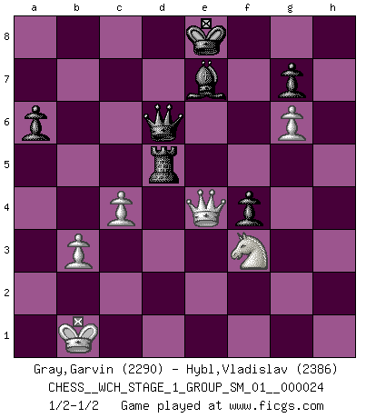 Last move : 1/2-1/2 2021 October 15 2:32:53 [Event "FICGS__CHESS__WCH_STAGE_1_GROUP_SM_01__000024"] [Site "FICGS"] [Date "2021.07.11"] [Round "1"] [White "Gray,Garvin"] [Black "Hybl,Vladislav"] [Result "1/2-1/2"] [WhiteElo "2290"] [BlackElo "2386"] 1.e4 c5 2.Nf3 d6 3.d4 cxd4 4.Nxd4 Nf6 5.Nc3 a6 6.Bg5 e6 7.f4 Qb6 8.Nb3 Be7 9.Bxf6 Bxf6 10.Qd2 O-O 11.O-O-O Nc6 12.Kb1 Be7 13.h4 Qa7 14.a3 b5 15.g4 b4 16.axb4 Nxb4 17.g5 Rb8 18.h5 Qc7 19.Nd4 d5 20.Bg2 dxe4 21.Bxe4 Rd8 22.Qe2 e5 23.Nf3 Rxd1+ 24.Rxd1 exf4 25.Bd5 Bb7 26.Bxf7+ Kxf7 27.g6+ hxg6 28.hxg6+ Ke8 29.Qe6 Bd5 30.Rxd5 Nxd5 31.Nxd5 Qd6 32.Qe4 Rb5 33.c4 Rc5 34.b3 Rxd5 1/2-1/2 Sicilian : Najdorf, 7...Qb6 Kingside Castling by player Black (move 10) Queenside Castling by player White (move 11) This chess game ended in a draw. Follow this game move after move (download)Place the contents of the Chess box in a hat, shake them up vigorously, pour them on the board from a height of two feet, and you get the style of Steinitz. (H. E. Bird) Wenn du nicht weißt was du tun sollst, warte bis dein Gegner eine Idee hat. Sie wird sicher schlecht sein. (Siegbert Tarrasch) En la vida, como en el Ajedrez, los Peones propios obstruyen nuestro camino. La gran fortuna de un hombre, su comodidad, placer, hijos, libros, que deberían ayudarle a ganar, con mucha frecuencia lo ponen en Jaque Mate. (Charles Buxton) J'ai toujours senti une vague pitié pour l'homme qui ne connaît rien aux échecs, tout comme j'en aurais pour un homme ignorant de l'amour. Les Echecs, comme la musique ou comme l'amour, ont le pouvoir de rendre heureux. (Siegbert Tarrasch) Chess is as much a mystery as women. (Purdy)