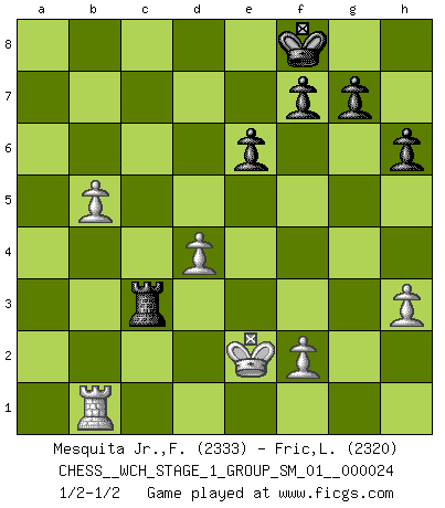 Last move : 1/2-1/2 2021 September 26 21:21:0 [Event "FICGS__CHESS__WCH_STAGE_1_GROUP_SM_01__000024"] [Site "FICGS"] [Date "2021.07.11"] [Round "1"] [White "Mesquita Jr.,Fausto Monteiro"] [Black "Fric,Lubos"] [Result "1/2-1/2"] [WhiteElo "2333"] [BlackElo "2320"] 1.d4 Nf6 2.c4 e6 3.Nf3 d5 4.Nc3 c6 5.e3 Nbd7 6.Qc2 Bd6 7.Bd3 O-O 8.O-O dxc4 9.Bxc4 b5 10.Be2 Bb7 11.Rd1 Be7 12.Ne5 a6 13.b3 Qb6 14.Bb2 Rfd8 15.a4 Rac8 16.Bf1 h6 17.h3 c5 18.Nxd7 Rxd7 19.dxc5 Rxc5 20.b4 R5c7 21.axb5 axb5 22.Qe2 Rxd1 23.Rxd1 Rc8 24.Nxb5 Ba6 25.Ra1 Ne8 26.Bd4 Qb7 27.Qh5 Rd8 28.Ra4 Bf6 29.Qf3 Qxf3 30.gxf3 Bxb5 31.Bxb5 Bxd4 32.Bxe8 Rxe8 33.exd4 Rc8 34.Ra1 Rc3 35.Rb1 Rxf3 36.b5 Rc3 37.Kf1 Kf8 38.Ke2 1/2-1/2 Queen's pawn game Kingside Castling by player Black (move 7) Kingside Castling by player White (move 8) This chess game ended in a draw. Follow this game move after move (download)There are two types of sacrifices: correct ones and mine. (Mikhail Tal) Gewöhnliche Menschen denken nur daran, wie sie ihre Zeit verbringen. Ein intelligenter Mensch versucht, sie auszunutzen. (Arthur Schopenhauer) Todo lo que importa ante el tablero de Ajedrez son buenas jugadas. (Bobby Fischer) On croit qu'il y a plus de mauvais joueurs que de bons joueurs, c'est faux : Il y a autant de joueurs qui gagnent que de joueurs qui perdent. (Philippe Geluck) Strategy without tactics is the slowest route to victory. Tactics without strategy is the noise before defeat. (Sun Tzu)