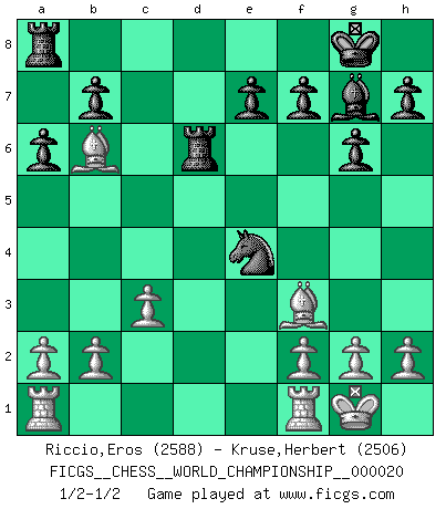 Last move : 1/2-1/2 2021 August 25 18:25:41 [Event "FICGS__CHESS__WORLD_CHAMPIONSHIP__000020"] [Site "FICGS"] [Date "2021.07.11"] [Round "1"] [White "Riccio,Eros"] [Black "Kruse,Herbert"] [Result "1/2-1/2"] [WhiteElo "2588"] [BlackElo "2506"] 1.e4 c5 2.Nc3 Nc6 3.Bb5 Nd4 4.Nf3 a6 5.Bd3 g6 6.Nxd4 cxd4 7.Ne2 d5 8.c3 dxc3 9.Qa4+ Bd7 10.Qd4 dxe4 11.Bxe4 Nf6 12.dxc3 Qc8 13.Nf4 Bc6 14.Nd5 Bg7 15.Be3 Bxd5 16.Bxd5 O-O 17.Bf3 Rd8 18.Qc5 Qe6 19.O-O Ne4 20.Qb6 Qxb6 21.Bxb6 Rd6 22.Bc7 Rd7 23.Bb6 Rd6 24.Bc7 Rd7 25.Bb6 Rd6 1/2-1/2 Sicilian : Closed, 2...Nc6 Kingside Castling by player Black (move 16) Kingside Castling by player White (move 19) This chess game ended in a draw. Follow this game move after move (download)Weak points or holes in the opponent's position must be occupied by pieces not Pawns. (Siegbert Tarrasch) Zum Sieg gelangt man nicht, wenn man gut, sondern nur wenn man besser spielt (Savielly Grigorievitsch Tartakower) En partidas rápidas, el Caballo es mas poderoso que el Alfil. (Vlastimil Hort) Ne tendez aucun piège pour le plaisir ! Ne jouez rien dans l'espoir que l'adversaire réagisse de façon stupide ! Prenez toujours pour acquis que l'adversaire va trouver le meilleur coup ! Ne jouez jamais de coup dans l'espoir que l'adversaire ne voie pas la menace ! Chacun de vos coups doit améliorer la position d'une façon ou d'une autre. The beginning of wisdom is silence. The second step is listening. (Unknown)