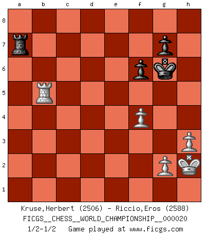 Last move : 1/2-1/2 2021 September 7 7:30:47 [Event "FICGS__CHESS__WORLD_CHAMPIONSHIP__000020"] [Site "FICGS"] [Date "2021.07.11"] [Round "2"] [White "Kruse,Herbert"] [Black "Riccio,Eros"] [Result "1/2-1/2"] [WhiteElo "2506"] [BlackElo "2588"] 1.c4 e6 2.d4 d5 3.Nc3 Nf6 4.Nf3 c6 5.e3 Nbd7 6.Qc2 Bd6 7.Bd3 O-O 8.O-O dxc4 9.Bxc4 b5 10.Bd3 Bb7 11.e4 e5 12.h3 a6 13.dxe5 Nxe5 14.Nxe5 Bxe5 15.Be3 Re8 16.a4 Qe7 17.Ne2 Bd6 18.Rfd1 Rad8 19.Bb6 Rb8 20.Ng3 Bc8 21.Bd4 c5 22.e5 Bxe5 23.Bxc5 Qc7 24.axb5 axb5 25.Ra7 Qc6 26.Ne4 Bb7 27.Nxf6+ Qxf6 28.Bxh7+ Kh8 29.Bf5 Bxb2 30.Be3 Be5 31.Bd3 Red8 32.Qe2 Kg8 33.Bh7+ Kxh7 34.Rxd8 Rxd8 35.Rxb7 Ra8 36.Qd3+ Qg6 37.Qxg6+ Kxg6 38.Rb6+ f6 39.f4 Bb8 40.Rxb5 Ba7 41.Bxa7 Rxa7 42.Kh2 1/2-1/2 English Opening Kingside Castling by player Black (move 7) Kingside Castling by player White (move 8) 10 pieces endgame at move 41 : White KRBPPP , Black KRPP WHITE : King + 1 Rook 1 Bishop 3 Pawns BLACK : King + 1 Rook 2 Pawns 9 pieces endgame at move 41 : White KRPPP , Black KRPP WHITE : King + 1 Rook 3 Pawns BLACK : King + 1 Rook 2 Pawns This chess game ended in a draw. Follow this game move after move (download)It began to feel as though you were playing against Chess itself. - On playing against Robert Fischer. (Walter Shipman) Ein typischer, sehr verbreiteter Gedankenschädling ist der, daß der betreffende Amateur von der Annanhme ausgeht, daß jeder einzelne Zug etwas zu leisten habe. (Aaron Nimzowitsch) El Ajedrez no es una pizca de inferior al violín, y tenemos un gran número de violinistas profesionales. (Mikhail Botvinnik) Des idées, des idées, j'en ai cent, j'en ai mille. Des bonnes, des mauvaises, applicables, irréalisables... Il suffit de faire le tri ! (Roos) When you've done things right people won't know you've done anything at all. (Futurama)