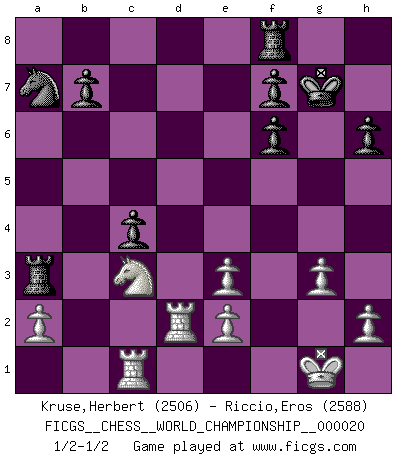 Last move : 1/2-1/2 2021 August 25 19:57:55 [Event "FICGS__CHESS__WORLD_CHAMPIONSHIP__000020"] [Site "FICGS"] [Date "2021.07.11"] [Round "4"] [White "Kruse,Herbert"] [Black "Riccio,Eros"] [Result "1/2-1/2"] [WhiteElo "2506"] [BlackElo "2588"] 1.d4 d5 2.Nf3 Nf6 3.g3 c5 4.Bg2 cxd4 5.O-O h6 6.b3 e6 7.Bb2 Bc5 8.Nxd4 O-O 9.c4 e5 10.Nc2 dxc4 11.b4 Be7 12.Bxe5 Nc6 13.Bc3 a5 14.bxa5 Nxa5 15.Qc1 Bd7 16.Qb2 Bc6 17.Bxc6 Nxc6 18.Ne3 Bc5 19.Rd1 Qe7 20.Bxf6 Qxf6 21.Qxf6 gxf6 22.Nc3 Bxe3 23.fxe3 Ra3 24.Rac1 Kg7 25.Rd2 Na7 26.Nb1 Ra4 27.Nc3 Ra3 28.Nb1 Ra4 29.Nc3 Ra3 1/2-1/2 Queen's pawn game Kingside Castling by player White (move 5) Kingside Castling by player Black (move 8) This chess game ended in a draw. Follow this game move after move (download)An attack on the wing should be met by play in the center. (Nimzovitch) Je mehr wir mit Computern analysieren, desto mehr glauben wir an Verteidigung. (Vladimir Kramnik) Jugadores de primera clase pierden en contra de jugadores de segunda clase porque los jugadores de segunda clase a veces juegan una partida de primer clase. (Siegbert Tarrasch) C'est la seule position que je connaisse où les deux camps sont mals. Propos prêtés à V. Anand. Children in the dark cause accidents, accidents in the dark cause children. (Unknown)
