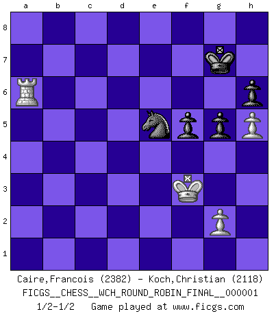 Last move : 1/2-1/2 2007 November 20 3:33:5 [Event "FICGS__CHESS__WCH_ROUND_ROBIN_FINAL__000001"] [Site "FICGS"] [Date "2007.07.14"] [Round "1"] [White "Caire,Francois"] [Black "Koch,Christian"] [Result "1/2-1/2"] [WhiteElo "2382"] [BlackElo "2118"] 1.d4 Nf6 2.c4 e6 3.Nf3 d5 4.Nc3 c6 5.e3 Nbd7 6.a3 Bd6 7.b4 O-O 8.Bb2 Qe7 9.Qc2 b6 10.c5 bxc5 11.dxc5 Bc7 12.Be2 e5 13.O-O Bb7 14.Nb5 Bb8 15.Nc3 Re8 16.Rfd1 a5 17.Rdc1 Ra7 18.Na4 d4 19.exd4 e4 20.Ne5 Nxe5 21.dxe5 Bxe5 22.Bxe5 Qxe5 23.Qc3 Qf4 24.Nb6 Ba6 25.Bxa6 Rxa6 26.Qe3 Qb8 27.b5 cxb5 28.h3 h6 29.Rab1 Rd8 30.Rxb5 Rd3 31.Qe1 a4 32.c6 Qc7 33.Qe2 Rxa3 34.Qc4 e3 35.Kf1 Kh8 36.Nd7 Rxc6 37.Qxc6 Qxd7 38.Qxd7 Nxd7 39.fxe3 Rxe3 40.Rb7 Ne5 41.Re1 Rxe1+ 42.Kxe1 g5 43.Ra7 Kg7 44.Ke2 Ng6 45.Kf3 Nf4 46.Rxa4 f5 47.h4 Ng6 48.Ra7+ Kf6 49.Ra6+ Kg7 50.Ra7+ Kf6 51.Ra6+ Kg7 52.h5 Ne5+ 1/2-1/2 Queen's pawn game Kingside Castling by player Black (move 7) Kingside Castling by player White (move 13) 10 pieces endgame at move 42 : White KRPP , Black KNPPPP WHITE : King + 1 Rook 2 Pawns BLACK : King + 1 Knight 4 Pawns 9 pieces endgame at move 46 : White KRPP , Black KNPPP WHITE : King + 1 Rook 2 Pawns BLACK : King + 1 Knight 3 Pawns This chess game ended in a draw. Follow this game move after move (download)After black's reply to 1.e4 with 1..e5, leaves him always trying to get into the game. (Howard Staunton) Das typische an einem Großmeister ist, daß er eine gewonnene Position schnell und schmerzlos gewinnt. (Irving Chernev) No es una movida, aún la mejor movida que tu debas buscar, sino un plan comprensible. (Eugene Znosko-Borovsky) A chaque perte on perd un peu de soi. (Joël Lautier) Computers make it easier to do a lot of things, but most of the things they make it easier to do don't need to be done. (Andy Rooney)