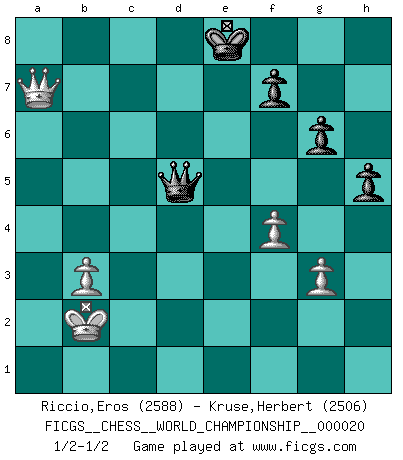 Last move : 1/2-1/2 2021 September 3 0:33:51 [Event "FICGS__CHESS__WORLD_CHAMPIONSHIP__000020"] [Site "FICGS"] [Date "2021.07.11"] [Round "7"] [White "Riccio,Eros"] [Black "Kruse,Herbert"] [Result "1/2-1/2"] [WhiteElo "2588"] [BlackElo "2506"] 1.e4 c5 2.Nc3 d6 3.d4 cxd4 4.Qxd4 Nc6 5.Qd2 g6 6.b3 Bh6 7.f4 Nf6 8.Bb2 O-O 9.O-O-O e5 10.g3 Re8 11.Kb1 Nd4 12.Qg2 Bg4 13.Be2 Nxe2 14.Ngxe2 exf4 15.gxf4 Bxe2 16.Nxe2 Nxe4 17.Ng3 d5 18.Rhe1 Nxg3 19.Rxe8+ Qxe8 20.hxg3 Qe4 21.Qf2 Bg7 22.Re1 Qb4 23.a3 Qa5 24.Bxg7 Kxg7 25.Qd4+ Kg8 26.Re7 Qxa3 27.Rxb7 Re8 28.Qd2 Qc5 29.Kb2 Re6 30.Rd7 Rd6 31.Rxd6 Qxd6 32.Qd4 h5 33.c4 Kf8 34.cxd5 Ke8 35.Qxa7 Qxd5 1/2-1/2 Sicilian : Closed Kingside Castling by player Black (move 8) Queenside Castling by player White (move 9) 10 pieces endgame at move 35 : White KQPPP , Black KQPPP WHITE : King + 1 Queen 3 Pawns BLACK : King + 1 Queen 3 Pawns This chess game ended in a draw. Follow this game move after move (download)There are two classes of men; those who are content to yield to circumstances and who play whist; those who aim to control circumstances, and who play Chess. (Mortimer Collins) Ein unbeabsichtigtes Patt ist der Gipfel der Dummheit. (Anonymous) El poder defensivo de una pieza clavada, solamente es imaginario. (Aaron Nimzovich) Le génie consiste à savoir transgresser les règles au moment opportun. (Teichmann) There's no money in correspondence chess. (John Knudsen)