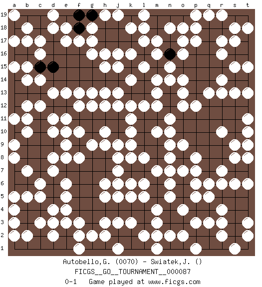 Last move : 0-1 2022 June 5 9:16:25 [Event "FICGS__GO__TOURNAMENT__000087"] [Site "FICGS"] [Date "2021.07.12"] [Round "1"] [Black "Autobello,Giovanni"] [White "Swiatek,Janusz"] [Result "0-1"] [Rating 1 "0070"] 1.e16 d4 2.p16 r16 3.q16 r17 4.q17 r14 5.r15 s15 6.q15 s13 7.s16 s17 8.t16 q3 9.r18 s18 10.s19 t15 11.t17 t18 12.q14 q13 13.r12 c17 14.p13 r13 15.q12 p12 16.p11 o12 17.o11 o13 18.p14 n11 19.n12 n14 20.n13 o14 21.o15 m13 22.m12 m14 23.l13 l12 24.m11 n10 25.l11 k12 26.k11 j12 27.j11 h12 28.h11 g12 29.g11 f12 30.f11 k14 31.k13 e11 32.e12 e13 33.d12 d13 34.c13 c14 35.b13 c12 36.c11 d11 37.c10 b12 38.a12 a11 39.a13 b11 40.m10 n9 41.m9 n8 42.m8 n7 43.m7 n6 44.m6 n5 45.m5 m4 46.n4 o4 47.n3 m3 48.l4 n2 49.o3 m2 50.l3 l2 51.k2 k3 52.k4 j3 53.p4 q5 54.o5 p6 55.l14 l15 56.j14 j13 57.h14 m17 58.j2 o2 59.j4 h3 60.h4 h2 61.h1 f3 62.g3 g2 63.g4 f2 64.d14 o17 65.c15 b14 66.a14 a15 67.d16 d18 68.p2 r3 69.f4 e4 70.t12 e6 71.s12 t13 72.l1 p3 73.q4 r4 74.f14 f17 75.f16 g17 76.o1 o4 77.o6 o7 78.d5 e5 79.d6 d7 80.c7 b5 81.e7 d8 82.d9 e8 83.f7 f8 84.g8 g7 85.f6 g9 86.h8 h9 87.h7 f10 88.g10 j9 89.g6 k8 90.c8 e10 91.c4 c5 92.b4 c6 93.b6 a5 94.f9 e9 95.f5 k6 96.e14 j6 97.d3 e3 98.e2 d2 99.c2 c3 100.b3 d3 101.g14 h16 102.g15 e15 103.d15 j15 104.e1 l5 105.f15 h6 106.k7 j7 107.l7 j8 108.n17 n18 109.n16 p18 110.d1 b2 111.c1 a3 112.b1 a4 113.a6 b7 114.a7 a8 115.b16 b17 116.a16 b15 117.c16 a17 118.d17 e18 119.k15 k16 120.m16 l17 121.m18 l18 122.m19 l19 123.q8 q10 124.o19 o18 125.n19 p19 126.p10 r10 127.j17 j16 128.h17 g16 129.f18 g18 130.f19 e17 131.q2 r2 132.r1 s1 133.q1 p1 134.n1 m1 135.k1 j1 136.g1 f1 137.q9 s8 138.r9 s9 139.s10 t10 140.s11 r7 141.q7 q6 142.r11 p7 143.l16 o16 144.q11 p8 145.t9 t8 146.k17 f13 147.r5 r6 148.s5 s6 149.t5 t6 150.m15 n15 151.t19 r19 152.g19 h19 153.h18 j19 154.a1 a2 155.j18 k18 156.n16 m16 157.b8 a9 158.q18 q19 159.c18 b18 160.c19 d19 161.b19 a19 162.b9 b10 163.c9 d10 164.e15 h15 165.l8 k10 166.j10 l6 167.l10 k9 168.l9 h10 169.l10 h13 170.m11 g13 171.l11 k11 172.l9 l8 173.m8 m7 174.m9 m12 175.g7 h5 176.g5 k5 177.o10 j5 178.p15 p17 179.p9 o9 180.q10 t9 181.r8 t11 182.s4 r10 183.t4 m10 184.s3 p5 185.s2 t2 186.d15 t3 187.c15 c16 0-1 Here are the names of the openings (joseki) played in the four corners : Corner q16 : p16 r16 Takamoku (Gomok, Gaomu`) 5-4 Point. The takamoku (high) point (5-4). With its emphasis on influence, the 5-4 point complements the 4-4 (hoshi) point in creating an influence-oriented fuseki. Komoku. Black responds with 3-3, 3-5, 4-6, 4-7, 3-6, 3-7. Corner d16 : e16 c17 Takamoku (Gomok, Gaomu`) 5-4 Point. The takamoku (high) point (5-4). With its emphasis on influence, the 5-4 point complements the 4-4 (hoshi) point in creating an influence-oriented fuseki. San-san. White plays the 3-3 when Black has a stone at top such as marked. Player White won this Go (weiqi, baduk) game. Follow this game move after move (download)Attach to the strongest stone in a pincer. (Anonymous) Knowledge will give you power, but character respect. (Bruce Lee)
