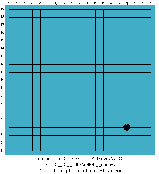 Last move : 1-0 2021 August 15 8:11:48 [Event "FICGS__GO__TOURNAMENT__000087"] [Site "FICGS"] [Date "2021.07.12"] [Round "1"] [Black "Autobello,Giovanni"] [White "Petrova,Natalia"] [Result "1-0"] [Rating 1 "0070"] 1.q4 1-0 This go game has been lost on time (started : 2021.07.12 10:54:13) Here are the names of the openings (joseki) played in the four corners : Corner q4 : q4 1-0 Hoshi (Hwajeom, Seongjeom, Xingwei`) 4-4 Point. The star or hoshi (4-4) point, emphasizing influence at the potential expense of territory. Player Black won this Go (weiqi, baduk) game. Follow this game move after move (download)Be a little patient. Keshi works ! (Anonymous) Panic is a sudden desertion of us, an a going over to the enemy of our imagination. (Christian Nevell Bovee)