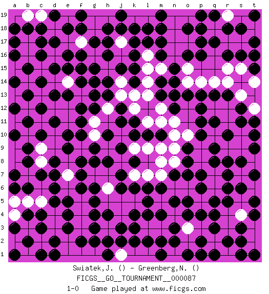 Last move : 1-0 2022 March 22 13:41:17 [Event "FICGS__GO__TOURNAMENT__000087"] [Site "FICGS"] [Date "2021.07.12"] [Round "1"] [Black "Swiatek,Janusz"] [White "Greenberg,Normund"] [Result "1-0"] 1.q4 p5 2.q5 q6 3.p6 o6 4.p7 r6 5.r8 n6 6.p4 r3 7.o5 q7 8.q8 p8 9.o7 n8 10.n7 r4 11.r5 s5 12.s6 s7 13.r7 r9 14.d17 d16 15.e16 f16 16.e15 e14 17.d15 e17 18.f15 g15 19.g14 c15 20.c14 c17 21.c16 c13 22.b15 g13 23.h14 f14 24.h13 h12 25.g12 f13 26.j12 h11 27.f12 k12 28.j11 j10 29.h10 g11 30.f11 g10 31.f10 j13 32.g9 g10 33.j9 j8 34.h8 k9 35.k8 k7 36.l8 m8 37.k10 l9 38.l10 l7 39.j7 h7 40.k8 b16 41.c18 b17 42.e18 f17 43.f18 g18 44.g17 g16 45.h17 j17 46.h18 g19 47.j18 h19 48.k18 l18 49.l17 l16 50.m17 k17 51.m16 m15 52.n15 o14 53.n14 n17 54.m18 l19 55.m19 k19 56.r16 j19 57.h16 h15 58.j15 n16 59.m14 o15 60.q17 n13 61.m13 m12 62.n12 l15 63.o13 l13 64.p13 m11 65.j6 t6 66.s8 t7 67.r6 t8 68.t9 l14 69.n13 n11 70.p11 q10 71.p10 s9 72.t5 s4 73.s2 q12 74.p12 p9 75.o8 o10 76.m10 p14 77.q13 r14 78.r13 s13 79.s12 t12 80.s11 r12 81.q11 r11 82.r10 t11 83.t10 s10 84.q9 q14 85.p16 s15 86.s16 t16 87.t17 s17 88.t15 l11 89.k11 n18 90.f19 g11 91.c4 j5 92.j3 h12 93.e4 m9 94.k6 n10 95.l6 m7 96.m6 f9 97.f8 e8 98.e9 j2 99.h2 j4 100.k3 l3 101.k2 j1 102.g3 k1 103.l2 l1 104.m1 e12 105.d13 m5 106.n5 h6 107.g5 m2 108.h1 d14 109.e13 e11 110.e10 t18 111.t16 t3 112.r2 q2 113.q3 s1 114.p2 q1 115.p1 r1 116.t1 g7 117.f7 f5 118.f6 f4 119.e5 e6 120.d6 e7 121.d8 d7 122.c7 f3 123.g4 g6 124.g8 h5 125.k4 k5 126.l5 m4 127.l4 m3 128.n2 o3 129.n3 n4 130.o4 f13 131.g13 j14 132.k14 k13 133.k15 j16 134.k16 b14 135.b13 b12 136.c12 d12 137.d11 a13 138.a14 a15 139.a16 c19 140.b18 a17 141.a18 r1 142.q1 t14 143.t13 t12 144.t11 r17 145.r18 r19 146.s18 s19 147.t19 q19 148.p19 q18 149.p18 t6 150.t7 m3 151.m4 n1 152.o1 g1 153.g2 f1 154.f2 e2 155.e3 j1 156.j2 l3 157.m2 t2 158.s1 c11 159.b11 a11 160.a12 b10 161.c10 c9 162.b9 a9 163.a10 c8 164.b8 a8 165.a7 b5 166.b6 c5 167.b4 b3 168.c3 a4 169.d5 c2 170.b2 a2 171.a3 b1 172.a1 d3 173.c1 d4 174.d2 n19 175.o16 l19 176.l18 r19 177.q19 b17 178.c17 g16 179.g15 r15 180.t13 o17 181.p17 k19 182.j19 t12 183.h4 h6 184.g6 t4 185.s3 b19 186.d19 e7 187.d7 f17 188.f16 j17 189.k17 a5 190.a6 b16 191.a17 n9 192.o9 e1 193.d1 s4 194.t4 o19 195.o18 e14 196.f14 1-0 Here are the names of the openings (joseki) played in the four corners : Corner q4 : q4 p5 Hoshi (Hwajeom, Seongjeom, Xingwei`) 4-4 Point. The star or hoshi (4-4) point, emphasizing influence at the potential expense of territory. Corner d16 : d17 d16 Komoku (Somok, Xiao~mu`) 3-4 Point. The komoku (3-4) point is the traditional corner enclosure move.. Corner q16 : l18 l17 This joseki is unknown. A weak or weird move has probably been played in this corner. Player Black won this Go (weiqi, baduk) game. Follow this game move after move (download)The weak player fears ko, the strong player seeks it. (Bill Taylor) Without deviation from the norm, progress is not possible. (Frank Zappa)