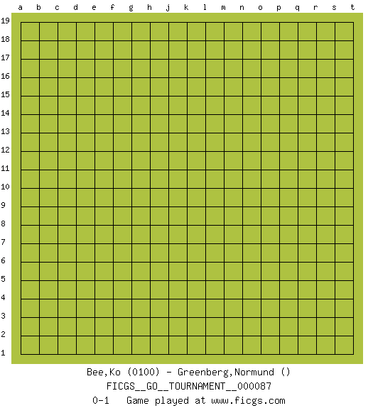 Last move : 0-1 2021 August 11 12:23:54 [Event "FICGS__GO__TOURNAMENT__000087"] [Site "FICGS"] [Date "2021.07.12"] [Round "1"] [Black "Bee,Ko"] [White "Greenberg,Normund"] [Result "0-1"] [Rating 1 "0100"] 0-1 This go game has been lost on time (started : 2021.07.12 10:54:13) Here are the names of the openings (joseki) played in the four corners : Player White won this Go (weiqi, baduk) game. Follow this game move after move (download)Only amateurs try to come up with fancy moves. (Anonymous) I live to kill Traxler counterattack. (Ilmars Cirulis)