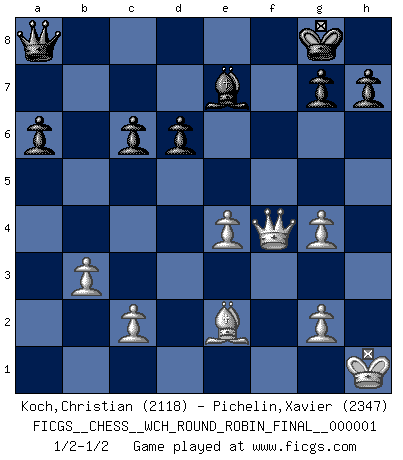 Last move : 1/2-1/2 2007 September 8 23:28:51 [Event "FICGS__CHESS__WCH_ROUND_ROBIN_FINAL__000001"] [Site "FICGS"] [Date "2007.07.14"] [Round "1"] [White "Koch,Christian"] [Black "Pichelin,Xavier"] [Result "1/2-1/2"] [WhiteElo "2118"] [BlackElo "2347"] 1.e4 c5 2.Nf3 d6 3.d4 cxd4 4.Nxd4 Nf6 5.Nc3 a6 6.Bg5 e6 7.f4 Qb6 8.Qd2 Qxb2 9.Rb1 Qa3 10.f5 Nc6 11.fxe6 fxe6 12.Nxc6 bxc6 13.Be2 Be7 14.O-O O-O 15.Rb3 Qc5+ 16.Be3 Qe5 17.Bf4 Qc5+ 18.Kh1 Ng4 19.h3 e5 20.Na4 Qa7 21.hxg4 exf4 22.Nb6 Be6 23.Nxa8 Bxb3 24.axb3 Qxa8 25.Rxf4 Rxf4 26.Qxf4 1/2-1/2 Sicilian : Najdorf, 7...Qb6 Kingside Castling by player White (move 14) Kingside Castling by player Black (move 14) This chess game ended in a draw. Follow this game move after move (download)I won't play with you anymore. You have insulted my friend. - When an opponent cursed himself for a blunder. (Miguel Najdorf) Aljechin war kein Nazi. Er war ein Opportunist. Ein schrecklicher Mann. Er liebte Geld über alles und würde für Geld ein Jude, ein Katolik oder ein Protestant werden. (Miguel Najdorf) No nos podemos resistir a la fascinación de un sacrificio ya que la pasión por los sacrificios es parte de la naturaleza de un jugador de Ajedrez. (Rudolf Spielman) Aux échecs, l'amour-propre est satisfait quand on remporte la victoire, mais il n'y a pas de honte à être battu. (Benjamin Franklin) A married woman is like a fish riding a bicycle. (Rodolfo d'Ettorre)