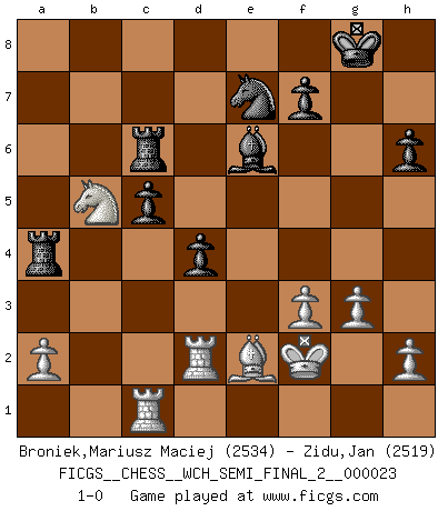 Last move : 1-0 2021 November 30 13:33:17 [Event "FICGS__CHESS__WCH_SEMI_FINAL_2__000023"] [Site "FICGS"] [Date "2021.07.13"] [Round "1"] [White "Broniek,Mariusz Maciej"] [Black "Zidu,Jan"] [Result "1-0"] [WhiteElo "2534"] [BlackElo "2519"] 1.d4 Nf6 2.c4 e6 3.Nc3 Bb4 4.f3 c5 5.d5 b5 6.e4 d6 7.Nge2 bxc4 8.Nf4 g5 9.Nfe2 exd5 10.exd5 Qe7 11.Bd2 Nbd7 12.Qc2 Nb6 13.Bxg5 h6 14.Bh4 Bxc3+ 15.Qxc3 Nbxd5 16.Qxc4 Rb8 17.Rd1 Rb4 18.Qxd5 Nxd5 19.Bxe7 Nxe7 20.b3 d5 21.g3 O-O 22.Rd2 a5 23.Nc3 Be6 24.Kf2 Rc8 25.Ba6 Rc6 26.Bb5 Rc7 27.Be2 d4 28.Nb5 Rc6 29.Rc1 a4 30.Na7 Rc7 31.Nb5 Rc6 32.bxa4 Rxa4 1-0 Nimzo-Indian : Kmoch variation Kingside Castling by player Black (move 21) Player White won this chess game. Follow this game move after move (download)Kasparov : J'adoube , Ivanchuk : S'il vous plaît ! (Garry Kasparov & Vassily Ivanchuk, Linares 1997) Die Jungen erwarten, dass Opa einfach umfällt. Dann aber kann Opa fünf Stunden lang Schach spielen und die jungen Gegner an die Wand drücken. (Viktor Kortschnoi) Yo adoro todas la posiciones. Denme una partida posicional difÃcil, y la jugaré. Pero posiciones totalmente ganadas, no las tolero. (Hein Donner) Il vaut toujours mieux jouer un plan faux de façon logique que de n'avoir pas de plan du tout. (Victor Kortchnoï) The real danger is not that computers will begin to think like men, but that men will begin to think like computers. (Sydney J. Harris)