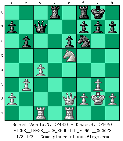 Last move : 1/2-1/2 2021 September 5 16:56:23 [Event "FICGS__CHESS__WCH_KNOCKOUT_FINAL__000022"] [Site "FICGS"] [Date "2021.07.13"] [Round "8"] [White "Bernal Varela,Nelson"] [Black "Kruse,Herbert"] [Result "1/2-1/2"] [WhiteElo "2483"] [BlackElo "2506"] 1.Nf3 Nf6 2.d4 e6 3.c4 b6 4.g3 Ba6 5.b3 Bb4+ 6.Bd2 Be7 7.Bg2 c6 8.Bc3 d5 9.Nbd2 Nbd7 10.O-O O-O 11.Re1 Bb7 12.e4 dxe4 13.Nxe4 c5 14.Nxf6+ Bxf6 15.Rc1 cxd4 16.Bxd4 Qc7 17.Qe2 Rad8 18.Bxf6 Nxf6 19.Ne5 Bxg2 20.Kxg2 1/2-1/2 Reti Opening Kingside Castling by player White (move 10) Kingside Castling by player Black (move 10) This chess game ended in a draw. Follow this game move after move (download)Fischer wanted to give the Russians a taste of their own medicine. (Larry Evans) Ich verachte die Medien. (Robert James Fischer) Mis oponentes también hacen buenas movidas. A veces yo no tomo esas cosas en consideración. (Bobby Fischer) La guerre est enfant de la passion, la passion est enfant du narcissisme et le narcissisme est l'enfant. (...) Une autre partie ? (Thibault de Vassal) There's no money in correspondence chess. (John Knudsen)