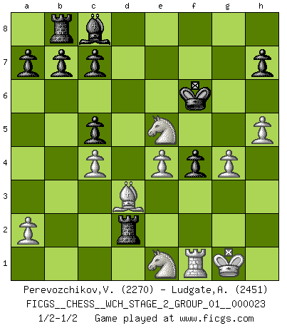 Last move : 1/2-1/2 2021 September 30 8:22:41 [Event "FICGS__CHESS__WCH_STAGE_2_GROUP_01__000023"] [Site "FICGS"] [Date "2021.07.13"] [Round "1"] [White "Perevozchikov,Vjacheslav"] [Black "Ludgate,Alan"] [Result "1/2-1/2"] [WhiteElo "2270"] [BlackElo "2451"] 1.d4 Nf6 2.c4 g6 3.Nf3 Bg7 4.Nc3 O-O 5.e4 d6 6.Be2 e5 7.O-O exd4 8.Nxd4 Re8 9.f3 Nc6 10.Nc2 Nh5 11.Be3 Be5 12.Nd5 Ne7 13.Nc3 Nc6 14.g3 f5 15.Nd5 Bxb2 16.Rb1 Bg7 17.g4 f4 18.Bf2 Nf6 19.Nxf4 Nd7 20.h4 Nc5 21.Qd2 Rb8 22.Rbd1 Rf8 23.h5 Be5 24.Bxc5 dxc5 25.Qxd8 Rxd8 26.Nd5 g5 27.Ne7+ Kg7 28.Nxc6 Rxd1 29.Nxe5 Rd2 30.Bd3 Kf6 31.f4 gxf4 32.Ne1 1/2-1/2 King's Indian, 3.Nf3 Kingside Castling by player Black (move 4) Kingside Castling by player White (move 7) This chess game ended in a draw. Follow this game move after move (download)Modern Chess is too much concerned with things like Pawn structure. Forget it, Checkmate ends the game. (Nigel Short) Ich suche im Schach immer etwas Eigenes. Riskantes Spiel im Stile schachlicher Musketiere ist nicht meine Sache, auch wenn es vielen Freunden scharfer Wendungen gefällt. (Anatoly Karpov) ¿Que sería del Ajedrez sin errores graciosos?. (Kurt Richter) Le profane ne songe pas à la somme de jouissance dont il se prive, qui méconnaît ce jeu aux ressources aussi variées que passionnantes. (Jean-Marie Jeanton-Lamarche) Never risk one's whole fortune unless supported by one's entire army. (Niccolo Machiavelli)