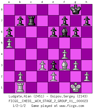 Last move : 1/2-1/2 2021 July 30 15:49:47 [Event "FICGS__CHESS__WCH_STAGE_2_GROUP_01__000023"] [Site "FICGS"] [Date "2021.07.13"] [Round "1"] [White "Ludgate,Alan"] [Black "Osipov,Sergey"] [Result "1/2-1/2"] [WhiteElo "2451"] [BlackElo "2143"] 1.c4 e6 2.g3 Nf6 3.Bg2 d5 4.Nf3 dxc4 5.Qa4+ Bd7 6.Qxc4 c5 7.Ne5 Qc8 8.Nxd7 Qxd7 9.O-O Be7 10.Nc3 Nc6 11.d3 Rc8 12.a4 O-O 13.a5 Rfd8 14.Qa4 Nd4 15.Be3 Ng4 16.Qxd7 Rxd7 17.Bxd4 cxd4 18.Nb5 a6 19.Na3 Ne5 20.f4 Ng4 21.Rfc1 Rdc7 22.Rxc7 Rxc7 23.Nc4 Ne3 24.Nxe3 dxe3 25.Bf3 Bf6 26.Rb1 g6 1/2-1/2 English Opening Kingside Castling by player White (move 9) Kingside Castling by player Black (move 12) This chess game ended in a draw. Follow this game move after move (download)The most important feature of the Chess position is the activity of the pieces. This is absolutely fundamental in all phases of the game: Opening, Middlegame and especially Endgame. The primary constraint on a piece's activity is the Pawn structure. (Michael Stean) Kleine Schachspieler machen Mist, und große Schachspieler machen Mist, aber große machen weniger Mist. (Fritz Sämisch) El Ajedrez es 99 por ciento táctica. (Teichmann) Il vaut toujours mieux jouer un plan faux de façon logique que de n'avoir pas de plan du tout. (Victor Kortchnoï) The absolute truth is the thing that makes people laugh. (Carl Reiner)