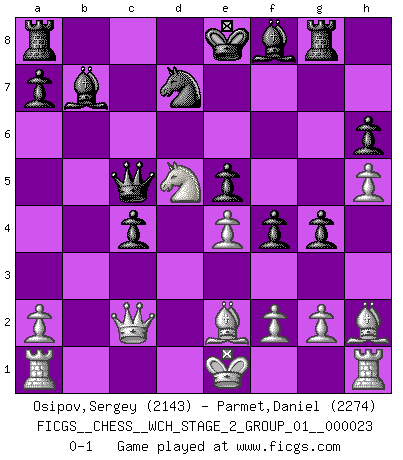 Last move : 0-1 2021 September 12 23:3:36 [Event "FICGS__CHESS__WCH_STAGE_2_GROUP_01__000023"] [Site "FICGS"] [Date "2021.07.13"] [Round "1"] [White "Osipov,Sergey"] [Black "Parmet,Daniel"] [Result "0-1"] [WhiteElo "2143"] [BlackElo "2274"] 1.d4 d5 2.Nf3 Nf6 3.c4 c6 4.Nc3 e6 5.Bg5 h6 6.Bh4 dxc4 7.e4 g5 8.Bg3 b5 9.h4 g4 10.Ne5 Nbd7 11.Be2 Bb7 12.Nxd7 Qxd7 13.Be5 Qe7 14.b3 Rg8 15.Qc2 Nd7 16.Bg3 e5 17.d5 cxd5 18.Nxd5 Qc5 19.bxc4 f5 20.h5 f4 21.Bh2 bxc4 0-1 This chess game has been lost on time (started : 2021.07.13 17:37:27) Queen's pawn game Player Black won this chess game. Follow this game move after move (download)Fischer was a master of clarity and a king of artful positioning. His opponents would see where he was going but were powerless to stop him. (Bruce Pandolfini) Ein Buch ist ein Spiegel; wenn ein Affe hineinsieht, so kann kein Apostel heraus gucken. (Georg Christoph Lichtenberg) Un jugador que es sorprendido, esta derrotado a medias. (Proverbio) Vous savez, camarade Pachman, je n'éprouve pas de plaisir à être ministre, je jouerais plutôt aux échecs comme vous, ou alors ferais une révolution au Venezuela. (Che Guevara à Ludek Pachman, 'Checkmate in Prague', 1975) Art disturbs, science reassures. (Georges Braque, Le Jour et la Nuit)