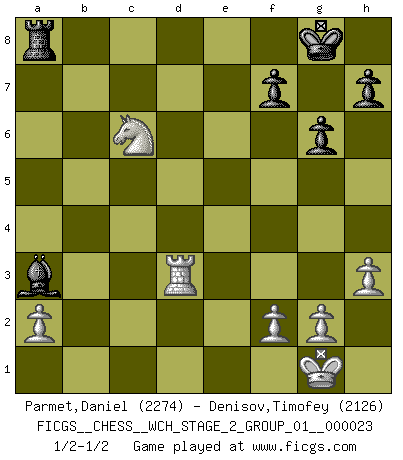 Last move : 1/2-1/2 2021 August 8 4:8:22 [Event "FICGS__CHESS__WCH_STAGE_2_GROUP_01__000023"] [Site "FICGS"] [Date "2021.07.13"] [Round "1"] [White "Parmet,Daniel"] [Black "Denisov,Timofey"] [Result "1/2-1/2"] [WhiteElo "2274"] [BlackElo "2126"] 1.d4 Nf6 2.c4 g6 3.Nc3 d5 4.Nf3 Bg7 5.Qb3 dxc4 6.Qxc4 O-O 7.e4 a6 8.Be2 b5 9.Qb3 c5 10.dxc5 Be6 11.Qc2 Nbd7 12.Be3 Rc8 13.Rd1 b4 14.Nd5 Bxd5 15.exd5 Nxc5 16.O-O Qd6 17.Rc1 Qb8 18.Bxc5 Nd7 19.Bxa6 Rxc5 20.Qd2 Rd8 21.Rxc5 Nxc5 22.Bc4 Na4 23.Nd4 Qd6 24.Rd1 Bf6 25.h3 Nb6 26.Bb3 Nxd5 27.Nc2 e6 28.Bxd5 Qxd5 29.Qxd5 exd5 30.Nxb4 Bxb2 31.Rxd5 Ra8 32.Rd3 Ba3 33.Nc6 1/2-1/2 King's Indian defense, 3.Nc3 Kingside Castling by player Black (move 6) Kingside Castling by player White (move 16) This chess game ended in a draw. Follow this game move after move (download)When you absolutely don't know what to do anymore, it is time to panic. (John van der Wiel) Später, ... hatte ich zunehmend Erfolg in entscheidenden Partien. Vielleicht weil ich eine einfache Wahrheit erkannte: nicht nur ich hatte Angst, auch mein Gegner. (Mikhail Nekhemyevich Tal) Tu puedes aprender mucho mas de una partida que pierdas que de una partida ganada. Tendras que perder cientos de partidas antes de llegar a ser un buen jugador. (Jose Raul Capablanca) Si le désir cupide (et stupide) de gagner est une inépuisable source de souffrance, une combinaison brillante sur l'échiquier est une découverte : le coquelicot qui s'épanouit lorsque apparaît la Voie Lactée. (Arrabal) The various flowers seem good to different people. (Chinese proverb)