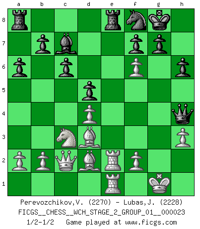 Last move : 1/2-1/2 2021 September 21 13:18:25 [Event "FICGS__CHESS__WCH_STAGE_2_GROUP_01__000023"] [Site "FICGS"] [Date "2021.07.13"] [Round "1"] [White "Perevozchikov,Vjacheslav"] [Black "Lubas,Jozef"] [Result "1/2-1/2"] [WhiteElo "2270"] [BlackElo "2228"] 1.d4 Nf6 2.c4 e6 3.Nf3 d5 4.Nc3 c6 5.e3 Nbd7 6.cxd5 exd5 7.Bd3 Bd6 8.O-O O-O 9.Qc2 Re8 10.Re1 h6 11.Bd2 Nf8 12.h3 a6 13.Re2 Be6 14.Rae1 Qc8 15.e4 Bxh3 16.e5 Qg4 17.Nh4 Qxh4 18.gxh3 Bc7 19.exf6 1/2-1/2 Queen's pawn game Kingside Castling by player White (move 8) Kingside Castling by player Black (move 8) This chess game ended in a draw. Follow this game move after move (download)I prefer to lose a really good game than to win a bad one. (David Levy) Ein Großmeister muß tausende Partien in seinem Kopf speichern, denn diese sind für Ihn, was die Worte der Muttersprache für gewöhnliche Leute sind, oder Noten für Musiker... (Garry Kasparov) Si el Ajedrez es una ciencia, es la mas inexacta. Si el Ajedrez es un arte, es demasiado inexacto para ser visto como tal. Si el Ajedrez es un deporte, es demasiado esotérico. Si el Ajedrez es un juego, es demasiado exigente para ser solo un juego. Si el Ajedrez es una aventura, es una muy demandante. Si el Ajedrez es una pasión, es una muy gratificante. Si el Ajedrez es la vida, es una muy triste. (Anónimo) Karpov est une pièce de musée. (Garry Kasparov) Heh, heh, heh. Time to abandon ship. (General Grievous in Star Wars ep.3)
