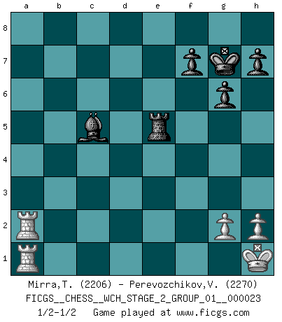 Last move : 1/2-1/2 2021 October 9 12:27:39 [Event "FICGS__CHESS__WCH_STAGE_2_GROUP_01__000023"] [Site "FICGS"] [Date "2021.07.13"] [Round "1"] [White "Mirra,Theodore"] [Black "Perevozchikov,Vjacheslav"] [Result "1/2-1/2"] [WhiteElo "2206"] [BlackElo "2270"] 1.d4 Nf6 2.c4 g6 3.Nc3 d5 4.cxd5 Nxd5 5.e4 Nxc3 6.bxc3 Bg7 7.Nf3 c5 8.Rb1 O-O 9.Be2 cxd4 10.cxd4 Qa5+ 11.Bd2 Qxa2 12.O-O Bg4 13.Be3 Nc6 14.d5 Bxf3 15.Bxf3 Ne5 16.Rxb7 a5 17.Be2 Rfe8 18.Bc5 a4 19.Bb5 Rec8 20.Bxe7 a3 21.d6 Qe6 22.d7 a2 23.dxc8Q+ Qxc8 24.Qd8+ Qxd8 25.Bxd8 Rxd8 26.Ra7 Rb8 27.Be2 Rb2 28.Ra8+ Bf8 29.f4 Rxe2 30.fxe5 Kg7 31.Ra1 Bc5+ 32.Kh1 Rxe4 33.R8xa2 Rxe5 1/2-1/2 King's Indian defense, 3.Nc3 Kingside Castling by player Black (move 8) Kingside Castling by player White (move 12) Promotion Queen by player White (move 23) This chess game ended in a draw. Follow this game move after move (download)The game of chess is the touchstone of the intellect. (Goethe) Man kann eine Schachpartie nur gewinnen, wenn das Gleichgewicht gestört ist. In einer Stellung mit ungestörtem Gleichgewicht ist auch das größte Genie hilflos - in der Stellung steckt dann eben kein genialer Einfall. (Wilhelm Steinitz) Realmente no sabemos como el juego fue inventado, aunque hay sospechas. Tan pronto como descubramos a los culpables, se los haremos saber. (Bruce Pandolfini) Avec des compensations pour le matériel en plus... (Anonyme) Life doesn't imitate art, it imitates bad television. (Woody Allen)