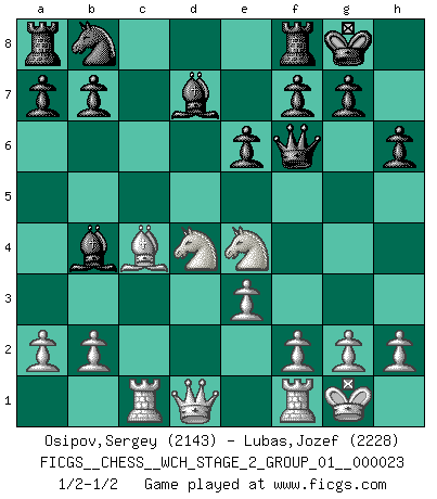 Last move : 1/2-1/2 2021 August 10 19:8:29 [Event "FICGS__CHESS__WCH_STAGE_2_GROUP_01__000023"] [Site "FICGS"] [Date "2021.07.13"] [Round "1"] [White "Osipov,Sergey"] [Black "Lubas,Jozef"] [Result "1/2-1/2"] [WhiteElo "2143"] [BlackElo "2228"] 1.d4 Nf6 2.c4 e6 3.Nf3 d5 4.Nc3 Bb4 5.Bg5 h6 6.Bxf6 Qxf6 7.e3 O-O 8.Rc1 dxc4 9.Bxc4 c5 10.O-O cxd4 11.Nxd4 Bd7 12.Ne4 1/2-1/2 Queen's pawn game Kingside Castling by player Black (move 7) Kingside Castling by player White (move 10) This chess game ended in a draw. Follow this game move after move (download)At this time Fischer is simply a level above all the best Chessplayers in the world. (John Jacobs) Habe Mut, dich deines eigenen Verstandes zu bedienen. (Immanuel Kant) ¿Que sería del Ajedrez sin errores graciosos?. (Kurt Richter) Que feriez-vous si vous étiez en train de jouer aux échecs et que la fin du monde arrive ? Je continuerais à jouer. (Saint Borromée) The obstacle is the path. (Zen proverb)