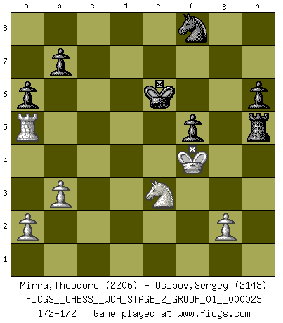 Last move : 1/2-1/2 2021 August 7 12:1:23 [Event "FICGS__CHESS__WCH_STAGE_2_GROUP_01__000023"] [Site "FICGS"] [Date "2021.07.13"] [Round "1"] [White "Mirra,Theodore"] [Black "Osipov,Sergey"] [Result "1/2-1/2"] [WhiteElo "2206"] [BlackElo "2143"] 1.d4 e6 2.e4 d5 3.Nc3 Nf6 4.e5 Nfd7 5.f4 c5 6.Nf3 Nc6 7.Be3 a6 8.Ne2 Qb6 9.Qc1 Be7 10.c3 O-O 11.h4 f6 12.h5 h6 13.Rh3 Rf7 14.Rg3 Qa5 15.Qd2 Nb6 16.b3 Nd7 17.f5 Nf8 18.Bxh6 cxd4 19.exf6 Bxf6 20.cxd4 Qxd2+ 21.Kxd2 exf5 22.Re1 Bd8 23.Kd1 Bc7 24.Nf4 Bd7 25.Ne5 Nxe5 26.dxe5 Re8 27.Nxd5 Bxe5 28.Rge3 gxh6 29.Rxe5 Rxe5 30.Rxe5 Kg7 31.Bc4 Be6 32.Ke2 Rd7 33.Ne3 Kf6 34.Ra5 Rg7 35.Bxe6 Kxe6 36.Kf3 Rg5 37.Kf4 Rxh5 1/2-1/2 Queen's pawn Kingside Castling by player Black (move 10) This chess game ended in a draw. Follow this game move after move (download)Play the opening like a book, the middle game like a magician, and the endgame like a machine. (Spielmann) Taktik ist was man tun muß, wenn etwas zu tun ist. Strategie ist was man tun muß, wenn nichts zu tun ist. (Savielly Grigorievitsch Tartakower) Del Ajedrez se ha dicho que la vida no es lo suficientemente larga para él, pero eso es culpa de la vida, no del Ajedrez. (William Ewart Napier) Les ravages du H expliquent la différence de niveau entre Tal et Thal [Abergel]. There are two types of people in this world, good and bad. The good sleep better, but the bad seem to enjoy the waking hours much more. (Woody Allen)