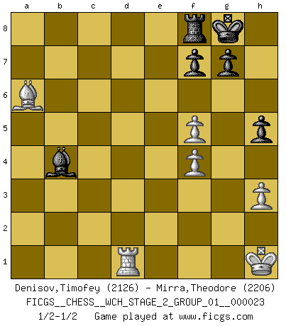 Last move : 1/2-1/2 2021 August 16 13:13:33 [Event "FICGS__CHESS__WCH_STAGE_2_GROUP_01__000023"] [Site "FICGS"] [Date "2021.07.13"] [Round "1"] [White "Denisov,Timofey"] [Black "Mirra,Theodore"] [Result "1/2-1/2"] [WhiteElo "2126"] [BlackElo "2206"] 1.e4 c5 2.Nf3 d6 3.d4 cxd4 4.Nxd4 Nf6 5.Nc3 a6 6.h3 e5 7.Nb3 Be6 8.Be3 Be7 9.f4 Nc6 10.f5 Bxb3 11.axb3 Nb4 12.g3 d5 13.exd5 Qc7 14.Bg2 Rd8 15.O-O e4 16.Bf4 Qc5+ 17.Kh1 Nbxd5 18.Nxd5 Nxd5 19.Qg4 h5 20.Qe2 O-O 21.c3 Bf6 22.b4 Qb6 23.Bxe4 Nxf4 24.gxf4 Qc7 25.Qf3 Rd2 26.Bxb7 Rxb2 27.Bxa6 Qxc3 28.Qxc3 Bxc3 29.Rab1 Rxb4 30.Rxb4 Bxb4 31.Rd1 1/2-1/2 Sicilian : Najdorf, Adams attack Kingside Castling by player White (move 15) Kingside Castling by player Black (move 20) This chess game ended in a draw. Follow this game move after move (download)A chess genius has died; a loss for humanity. (Viktor Kortchnoi, about Bobby Fischer's death) Ich bin der einzige Schachspieler, der sich während der Vorbereitungen zum Turnier verletzt hat. (Woody Allen) Nada excita más a Grandes Maestros aburridos que una novedad teórica. (Dominic Lawson) Toutes les manuvres exécutées sur une colonne ouverte ont pour but ultime l'intrusion définitive sur la septième ou la huitième rangée, en plein cur de la position ennemie. (Aaron Nimzovitch) When the going gets tactical, the computers get going. (Hyatt)