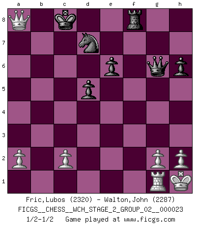 Last move : 1/2-1/2 2021 September 14 22:20:2 [Event "FICGS__CHESS__WCH_STAGE_2_GROUP_02__000023"] [Site "FICGS"] [Date "2021.07.13"] [Round "1"] [White "Fric,Lubos"] [Black "Walton,John"] [Result "1/2-1/2"] [WhiteElo "2320"] [BlackElo "2287"] 1.e4 c5 2.Nf3 d6 3.d4 cxd4 4.Nxd4 Nf6 5.Nc3 a6 6.Bg5 e6 7.f4 Qb6 8.Qd2 Qxb2 9.Rb1 Qa3 10.e5 h6 11.Bh4 dxe5 12.fxe5 Nd5 13.Nxd5 exd5 14.e6 Bxe6 15.Nxe6 fxe6 16.Rxb7 Nd7 17.Bd3 Be7 18.Bg6+ Kd8 19.Bxe7+ Kxe7 20.Qd4 Kd6 21.Qxg7 Rhd8 22.O-O Qe3+ 23.Kh1 Qe5 24.Qf7 Kc6 25.R7b1 Rf8 26.Qe7 Rxf1+ 27.Rxf1 Rf8 28.Rg1 Qf6 29.Qa3 Qxg6 30.Qxa6+ Kc7 31.Qa5+ Kc8 32.Qa8+ 1/2-1/2 Sicilian : Najdorf, 7...Qb6 Kingside Castling by player White (move 22) This chess game ended in a draw. Follow this game move after move (download)My God, Bobby Fischer plays so simply. (Alexei Suetin) Ich glaube, ich kenne inzwischen die Gründe für mein Versagen: schachliche Charakterfehler. Ich war nie ein Wunderkind und in meiner gesamten menschlichen Entwicklung immer zu langsam. (Viktor Kortschnoi) Fischer sacrificó virtualmente todo lo que la mayoría de nosotros los 'debiles' (término que él usa) valoramos, respetamos y apreciamos por el amor de un astuto, a menudo hermoso tablero de juego, por el privilegio ambivalente de ser su mas grande maestro. (Paul Kollar) Les Echecs représentent une sphère d'idées créatrices basée sur la volonté des deux protagonistes. (Smyslov) There are more things in heaven and earth than practically anywhere else. (Unknown)