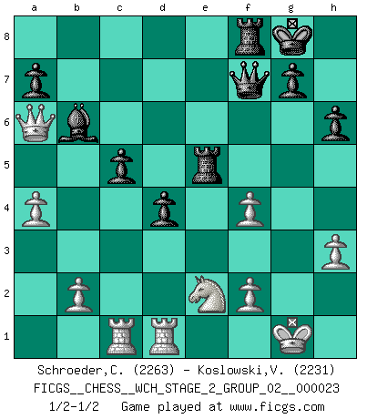 Last move : 1/2-1/2 2021 September 5 16:45:45 [Event "FICGS__CHESS__WCH_STAGE_2_GROUP_02__000023"] [Site "FICGS"] [Date "2021.07.13"] [Round "1"] [White "Schroeder,Christoph"] [Black "Koslowski,Volker"] [Result "1/2-1/2"] [WhiteElo "2263"] [BlackElo "2231"] 1.d4 d5 2.c4 c6 3.Nf3 Nf6 4.Nc3 e6 5.cxd5 exd5 6.Bg5 h6 7.Bxf6 Qxf6 8.e3 Bd6 9.Bd3 O-O 10.O-O Be6 11.Qb3 Na6 12.Bxa6 bxa6 13.Qd1 Bg4 14.h3 Bh5 15.e4 Bc7 16.e5 Qe7 17.Ne2 Bxf3 18.gxf3 Rab8 19.Qd2 f6 20.f4 c5 21.Rac1 fxe5 22.dxe5 d4 23.Rfd1 Bb6 24.Qd3 Qf7 25.Qxa6 Rbe8 26.a4 Rxe5 1/2-1/2 QGD Slav : 4.Nc3 Kingside Castling by player Black (move 9) Kingside Castling by player White (move 10) This chess game ended in a draw. Follow this game move after move (download)A bad day of Chess is better than any good day at work. (Anonymous) Das Schachspiel hat wie die Liebe, die Musik, die Fähigkeit, den Menschen glücklich zu machen. Ich habe ein leises Gefühl des Bedauerns für jeden, der das Schachspiel nicht kennt, so wie ich jeden bedaure, der die Liebe nicht kennt. (Siegbert Tarrasch) Cuando tengas duda... ¡juega al Ajedrez!. (Tevis) La vie est comme un jeu d'échecs : nous esquissons un plan, mais celui-ci est tributaire de ce que daignent faire l'adversaire aux échecs et le destin dans la vie. (Arthur Schopenhauer) A belief is an idea the mind possesses, an idea that possesses the mind. (Robert Oxden Bolton)