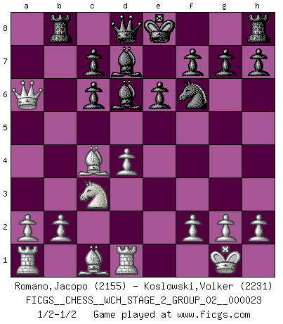 Last move : 1/2-1/2 2021 July 22 7:50:5 [Event "FICGS__CHESS__WCH_STAGE_2_GROUP_02__000023"] [Site "FICGS"] [Date "2021.07.13"] [Round "1"] [White "Romano,Jacopo"] [Black "Koslowski,Volker"] [Result "1/2-1/2"] [WhiteElo "2155"] [BlackElo "2231"] 1.d4 Nf6 2.c4 e6 3.Nf3 d5 4.Nc3 dxc4 5.e4 Bb4 6.Bxc4 Nxe4 7.O-O Nf6 8.Qa4+ Nc6 9.Ne5 Rb8 10.Rd1 Bd6 11.Nxc6 bxc6 12.Qxa7 Bd7 13.Qa6 1/2-1/2 Queen's pawn game Kingside Castling by player White (move 7) This chess game ended in a draw. Follow this game move after move (download)I'm not a materialistic person, in that, I don't suffer the lack or loss of money. The absence of worldly goods I don't look back on. For Chess is a way I can be as materialistic as I want without having to sell my soul. (Jamie Walter Adams) Modernes Schach erfordert enorme Anspannung. Es ist für einen normalen Menschen unmöglich das auszuhalten. (Viktor Kortschnoi) La táctica fluye a partir de una posición superior. (Bobby Fischer) Des points faibles ou des trous dans la position de l'adversaire doivent être occupés par des pièces et non pas par des pions. (Siegbert Tarrasch) They say in chess you've got to kill the queen, and then you mate it... Oh I, do you ? (Red Hot Chili Peppers, Fortune faded)