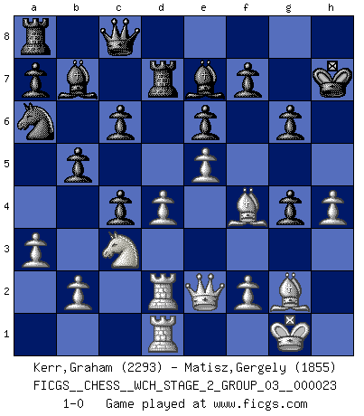 Last move : 1-0 2021 November 6 19:42:0 [Event "FICGS__CHESS__WCH_STAGE_2_GROUP_03__000023"] [Site "FICGS"] [Date "2021.07.13"] [Round "1"] [White "Kerr,Graham"] [Black "Matisz,Gergely"] [Result "1-0"] [WhiteElo "2293"] [BlackElo "1855"] 1.d4 Nf6 2.c4 e6 3.Nf3 b6 4.g3 Bb7 5.Bg2 Bb4+ 6.Bd2 Be7 7.O-O c6 8.Nc3 d5 9.Ne5 Nfd7 10.Bf4 O-O 11.e4 Nxe5 12.Bxe5 dxc4 13.Qg4 g6 14.Rfd1 Qc8 15.Bf4 Na6 16.a3 Rd8 17.h4 h5 18.Qe2 b5 19.Rd2 Rd7 20.Rad1 Kh7 21.g4 hxg4 22.e5 1-0 This chess game has been lost on time (started : 2021.07.13 17:37:25) Queen's Indian : Riumin variation Kingside Castling by player White (move 7) Kingside Castling by player Black (move 10) Player White won this chess game. Follow this game move after move (download)The combination player thinks forward; he starts from the given position, and tries the forceful moves in his mind. (Emanuel Lasker) Verschiedene, sehr schätzbare und im Laufe des Lebens nützliche Eigenschaften des Geistes können durch das Schachspiel erworben und gekräftigt werden, so dass sie zu Gewohnheiten werden, die uns nie im Stich lassen. (Benjamin Franklin) Cuando tu no sabes absolutamente que mas hacer, es tiempo de entrar en pánico. (John van der Wiel) J'apprécie les joueurs d'est-indienne, c'est grâce à eux que je nourris ma famille depuis tant d'années. (Petrosian) I just play for fun. (Anna Kournikova)