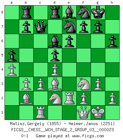 Last move : 0-1 2021 October 25 0:40:32 [Event "FICGS__CHESS__WCH_STAGE_2_GROUP_03__000023"] [Site "FICGS"] [Date "2021.07.13"] [Round "1"] [White "Matisz,Gergely"] [Black "Helmer,Janos"] [Result "0-1"] [WhiteElo "1855"] [BlackElo "2251"] 1.b3 c5 2.Bb2 Nc6 3.e3 d5 4.Nf3 Nf6 5.Bb5 Bd7 6.O-O e6 7.d4 cxd4 8.exd4 Rc8 9.Re1 Be7 10.Bf1 O-O 11.Nbd2 Qb6 12.a3 Rfd8 13.Bd3 Be8 14.c3 a5 15.a4 Bd6 16.g3 h6 17.Bc2 Qa6 18.Nf1 Ne7 19.Bd3 Qb6 20.Re2 Qc7 21.N1d2 Rb8 22.Qf1 Nh7 23.Rc1 Nf8 0-1 Nimzovich-Larsen attack : English variation Kingside Castling by player White (move 6) Kingside Castling by player Black (move 10) Player Black won this chess game. Follow this game move after move (download)He who fears an isolated Queen's Pawn should give up Chess. (Siegbert Tarrasch) Das Zentrum ist der Balkan des Schachbretts - Kriegshandlungen können in jedem Moment ausbrechen. (Aaron Nimzowitsch) Las combinaciones han sido siempre el aspecto más intrigante del Ajedrez. Los Maestros las buscan, el público las aplauden, los críticos las alaban. La razón se debe a que las combinaciones hacen posible que el Ajedrez sea más que un ejercicio matemático con una carencia de vida. Ellas son la poesía del juego, son del Ajedrez lo que la melodía es de la música. Ellas representan el triunfo de la mente sobre la materia. (Reuben Fine) Il s'avisa de me proposer d'apprendre les échecs qu'il jouait un peu... me voilà forcené des échecs. J'achète un échiquier, je m'enferme dans ma chambre, j'y passe des jours et des nuits à vouloir apprendre par cur toutes les parties. (Jean-Jacques Rousseau, Confessions) SEO proverb : Make your website optimized for human beings, not for search engines.