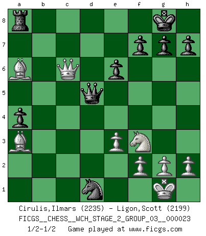 Last move : 1/2-1/2 2021 September 2 17:57:10 [Event "FICGS__CHESS__WCH_STAGE_2_GROUP_03__000023"] [Site "FICGS"] [Date "2021.07.13"] [Round "1"] [White "Cirulis,Ilmars"] [Black "Ligon,Scott"] [Result "1/2-1/2"] [WhiteElo "2235"] [BlackElo "2199"] 1.d4 d5 2.Nf3 Nf6 3.c4 dxc4 4.e3 c5 5.Bxc4 e6 6.O-O a6 7.b3 Nbd7 8.Bb2 Be7 9.Nbd2 b6 10.dxc5 Bxc5 11.Bd3 Bb7 12.Qe2 O-O 13.Rfd1 Qe7 14.a3 b5 15.b4 Bb6 16.a4 bxa4 17.Nc4 Rfd8 18.Ba3 Nd5 19.Nxb6 N7xb6 20.b5 Qe8 21.bxa6 Bxa6 22.Bxa6 Nc3 23.Qb2 Rxd1+ 24.Rxd1 Nxd1 25.Qxb6 Qd8 26.Qc6 Qd5 1/2-1/2 Queen's pawn game Kingside Castling by player White (move 6) Kingside Castling by player Black (move 12) This chess game ended in a draw. Follow this game move after move (download)Chess is a cold bath for the mind. (Sir John Simon) Pläne sind die Träume des Verständigen. (Ernst Freiherr von Feuchtersleben) Aquel que toma al Peón de Caballo de la Reina, se pasará la noche a dormir en la calle. (Anónimo) Des points faibles ou des trous dans la position de l'adversaire doivent être occupés par des pièces et non pas par des pions. (Siegbert Tarrasch) There are lots of people who mistake their imagination for their memory. (Josh Bilings)