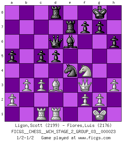 Last move : 1/2-1/2 2021 September 3 3:1:41 [Event "FICGS__CHESS__WCH_STAGE_2_GROUP_03__000023"] [Site "FICGS"] [Date "2021.07.13"] [Round "1"] [White "Ligon,Scott"] [Black "Flores,Luis"] [Result "1/2-1/2"] [WhiteElo "2199"] [BlackElo "2176"] 1.e4 e5 2.Nf3 Nc6 3.d4 exd4 4.Nxd4 Nf6 5.Nc3 Bb4 6.Nxc6 bxc6 7.Bd3 d5 8.exd5 cxd5 9.O-O O-O 10.h3 c6 11.Bf4 Bd6 12.Qd2 Qc7 13.Bxd6 Qxd6 14.Rfd1 Be6 15.Ne2 c5 16.c3 a5 17.Nf4 Rfd8 18.Qe3 Rab8 19.b3 Re8 20.Qf3 h6 21.Bc4 Rbd8 22.Bb5 Re7 23.Rac1 Ne4 24.Bd3 1/2-1/2 Scotch : Schmidt variation Kingside Castling by player White (move 9) Kingside Castling by player Black (move 9) This chess game ended in a draw. Follow this game move after move (download)Chess is as much a mystery as women. (Purdy) Über Karpov: Er war und ist ein Vertreter der russischen Reaktionäre. Das steckt tief in seiner Seele, wehalb ich nicht nett mit ihm umgehen kann. (Viktor Kortschnoi) Por tratar de evitar la pérdida de una pieza, muchas personas han perdido una partida de Ajedrez. (Savielly Tartakover) Pour moi, les échecs ne sont pas un jeu mais un art. (Alexandre Alekhine) We're missing something. (Gregory House, House M.D.)