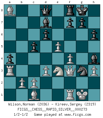 Last move : 1/2-1/2 2021 July 28 7:53:59 [Event "FICGS__CHESS__RAPID_SILVER__000273"] [Site "FICGS"] [Date "2021.07.16"] [Round "1"] [White "Wilson,Norman"] [Black "Kireev,Sergey"] [Result "1/2-1/2"] [WhiteElo "2036"] [BlackElo "2319"] 1.e4 c5 2.Ne2 Nf6 3.Nbc3 a6 4.g3 e5 5.Bg2 b5 6.d3 Be7 7.O-O d6 8.Qd2 Nc6 9.Nd1 a5 10.Ne3 a4 11.f4 h6 12.Qd1 O-O 13.Nc3 exf4 14.gxf4 b4 15.Ne2 Ng4 16.Nd5 Bh4 17.a3 bxa3 18.Rxa3 Bd7 19.h3 Nf6 20.Ne3 Nd4 21.e5 Nh5 22.Bxa8 Nxe2+ 23.Qxe2 Ng3 24.Qf3 1/2-1/2 Sicilian : Keres variation (2.Ne2) Kingside Castling by player White (move 7) Kingside Castling by player Black (move 12) This chess game ended in a draw. Follow this game move after move (download)When you play Bobby, it is not a question if you win or lose. It is a question if you survive. (Boris Spassky) Der Freibauer hat für mich eine Seele, genau wie der Mensch, Wünsche, die unerkannt in ihm schlummern, und Befürchtungen, von deren Existenz er selbst kaum ahnt. (Aaron Nimzowitsch) No puedes jugar al Ajedrez si eres de corazón noble. (Proverbio Francés) Je ne crois pas en la psychologie, je crois aux bons coups. (Robert Fischer) I don't know, I don't care, and it doesn't make any difference. (Albert Einstein)