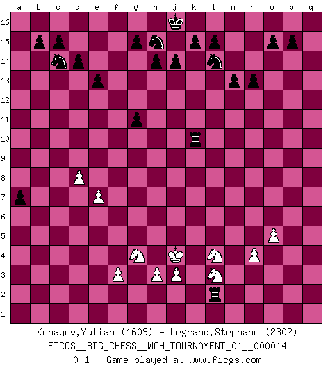 Last move : 0-1 2021 September 3 13:18:21 [Event "FICGS__BIG_CHESS__WCH_TOURNAMENT_01__000014"] [Site "FICGS"] [Date "2021.07.18"] [Round "1"] [White "Kehayov,Yulian"] [Black "Legrand,Stephane"] [Result "0-1"] [WhiteElo "1609"] [BlackElo "2302"] 1.j2-k4 p16-o14 2.h2-g4 b16-c14 3.m2-m4 e15-e13 4.h1-l4 j15-k13 5.e2-e4 m15-m13 6.e1-e3 l16-p12 7.m1-m3 f16-b12 8.g1-j2 n15-n13 9.d2-d4 d15-d14 10.n2-n3 c16-l8 11.k1-h2 o16-f8 12.o1-n2 h16-m12 13.c2-c3 m16-m14 14.l4-k3 m14-l14 15.k3-m5 m12-g12 16.f1-e2 l8-k7 17.m5-p5 f8-j11 18.n2-p4 g12-g4 19.p5-j11 g4-e2 20.e3-e2 k13-j11 21.e2-e1 k7-p2 22.p4-o3 p2-q1 23.o3-q1 g16-f14 24.q1-l6 f14-h13 25.m3-l3 q16-n16 26.c1-g5 f15-f13 27.l6-k5 n16-n14 28.k5-j6 p12-j6 29.k4-j6 b12-l3 30.j2-l3 l14-l6 31.j6-k4 l6-p6 32.l3-n2 p6-p2 33.o2-o4 p2-q2 34.b1-a3 o14-n12 35.e1-e3 n14-p14 36.j1-j2 e16-e14 37.l1-m2 e14-g14 38.h2-j4 g14-g10 39.e3-g3 a16-e16 40.a1-o1 e16-e14 41.g5-h6 g10-g3 42.j4-g3 p14-p6 43.h6-e3 e14-g14 44.m2-n1 g14-g10 45.o1-o2 q2-o2 46.n1-o2 g10-q10 47.e4-e5 n12-o10 48.e3-g5 o10-n8 49.g5-f6 k16-l14 50.f2-f3 n8-o6 51.o2-n1 o6-n4 52.k4-m3 j11-k9 53.f6-g7 k9-l7 54.n1-k4 q10-b10 55.b2-b4 b10-a10 56.a3-c2 a10-a2 57.c2-e3 l7-j6 58.j2-h2 j6-g7 59.k4-g7 h13-g11 60.m3-n5 p6-p7 61.g7-e9 f13-f12 62.e5-e6 p7-e7 63.e9-g11 f12-g11 64.d4-d5 e7-p7 65.c3-c4 n4-p3 66.n2-p3 p7-p3 67.p1-n2 p3-p2 68.n2-l3 p2-l2 69.h2-j2 q15-q13 70.n3-n4 q13-q12 71.n5-p4 q12-q11 72.g3-j4 q11-q10 73.j4-l5 a2-e2 74.e3-g4 e2-g2 75.g4-h2 g2-c2 76.p4-o6 c2-c4 77.o6-p8 q10-q9 78.p8-o10 q9-q8 79.l5-n6 c4-b4 80.n6-o8 b4-m4 81.o8-p10 m4-m10 82.p10-q8 m10-o10 83.q8-p6 a15-a13 84.o4-o5 a13-a12 85.j2-k3 l2-p2 86.d5-d6 o10-k10 87.k3-j4 p2-k2 88.h2-g4 a12-a11 89.d6-d7 a11-a10 90.p6-n5 a10-a9 91.d7-d8 a9-a8 92.e6-e7 a8-a7 93.n5-l4 k2-l2 0-1 Follow this game move after move (download)To avoid losing a piece, many a person has lost the game. (Savielly Tartakover) Ich tröste mich mit dem Vergnügen, daß Schachfans, Zuschauer und Leser glücklich sind, wenn ein Großmeister etwas riskiert, statt nur Klötzchen zu schieben. (Mikhail Nekhemyevich Tal) Un jugador que trata de regresar una movida en el Ajedrez es un futuro carterista. (Richard Fenton) Horreur, mais aussi harmonie suprême : qu'y avait-il en effet au monde en dehors des échecs ? Le brouillard, l'inconnu, le non-être... (Vladimir Nabokov) War is the child of passion, passion is the child of narcissism and narcissism is the child. (...) Another game ? (Thibault de Vassal)
