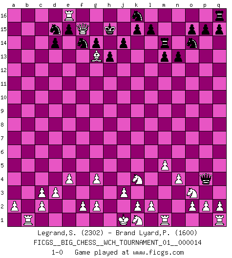 Last move : 1-0 2021 July 31 9:9:36 [Event "FICGS__BIG_CHESS__WCH_TOURNAMENT_01__000014"] [Site "FICGS"] [Date "2021.07.18"] [Round "1"] [White "Legrand,Stephane"] [Black "Brand Lyard,Paul"] [Result "1-0"] [WhiteElo "2302"] [BlackElo "1600"] 1.m2-m4 h15-g13 2.p1-o3 g15-g14 3.e2-e4 h16-c11 4.b1-c3 d15-d14 5.j2-k4 c11-j5 6.h2-g4 j5-o5 7.f1-c4 h14-h13 8.d2-d3 n15-n14 9.c1-l9 f15-f14 10.l1-p5 c16-n6 11.m4-m5 n6-l8 12.h1-l4 l8-g4 13.h3-g4 o16-b4 14.l4-b13 b4-c3 15.b2-c3 b15-b14 16.b13-e16 f16-o8 17.g1-j2 o8-k4 18.j2-k4 m15-m13 19.c4-h9 c15-c14 20.h9-c14 b16-c14 21.e16-a16 c14-e13 22.n2-n4 o5-p4 23.a1-b1 n14-n13 24.a16-a15 b14-b13 25.b1-b13 l16-m15 26.e1-b1 m15-a4 27.a15-a4 p16-o14 28.b13-b16 e13-d15 29.b16-e16 m16-m14 30.o1-c12 j16-h16 31.a4-a10 h16-h15 32.c12-g16 j15-g16 33.l9-g13 f14-g13 34.p5-g13 g16-f14 35.a10-f15 1-0 Follow this game move after move (download)By playing at Chess then, we may learn: First: Foresight... Second: Circumspection... Third: Caution... And lastly, we learn by Chess the habit of not being discouraged by present bad appearances in the state of our affairs, the habit of hoping for a favorable chance, and that of persevering in the secrets of resources. (Benjamin Franklin) Die Partien sind immer verschieden, die Interviews immer die gleichen. (Garry Kasparov) Las combinaciones han sido siempre el aspecto más intrigante del Ajedrez. Los Maestros las buscan, el público las aplauden, los críticos las alaban. La razón se debe a que las combinaciones hacen posible que el Ajedrez sea más que un ejercicio matemático con una carencia de vida. Ellas son la poesía del juego, son del Ajedrez lo que la melodía es de la música. Ellas representan el triunfo de la mente sobre la materia. (Reuben Fine) Mon pion favori sur ma case favorite ! Bronstein en parlant d'un coup de pion en h5 quand il avait les Noirs. The Internet is so big, so powerful and pointless that for some people it is a complete substitute for life. (Andrew Brown)