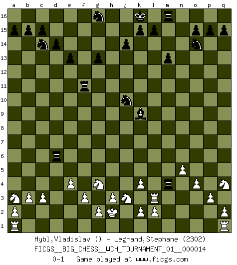 Last move : 0-1 2021 October 23 19:34:0 [Event "FICGS__BIG_CHESS__WCH_TOURNAMENT_01__000014"] [Site "FICGS"] [Date "2021.07.18"] [Round "1"] [White "Hybl,Vladislav"] [Black "Legrand,Stephane"] [Result "0-1"] [WhiteElo ""] [BlackElo "2302"] 1.m2-m4 b16-c14 2.j2-k4 e15-e13 3.h1-o7 h15-g13 4.b2-b3 p16-o14 5.n2-n4 f16-b12 6.g1-j2 m15-m13 7.l1-p5 k16-h15 8.e2-e4 l16-p12 9.o1-j6 p12-j6 10.k4-j6 j15-k13 11.d2-d4 n15-n13 12.c1-l9 d15-d14 13.p1-o3 h16-q8 14.l9-g13 h15-g13 15.p5-g13 h14-g13 16.o7-f15 c16-e14 17.f15-g15 q8-j15 18.g15-g14 j16-k16 19.e1-e3 k13-h12 20.g14-n8 o16-l13 21.n8-n13 l13-m12 22.n13-p13 m12-d4 23.c2-c3 d4-e3 24.p13-e3 q16-n16 25.n4-n5 e16-f16 26.f2-f3 f16-f12 27.f1-b5 n16-n10 28.b5-c6 j15-n11 29.h2-g4 n11-e3 30.g4-e3 f12-f6 31.c6-j12 n10-p10 32.j2-k4 e14-l8 33.j6-l5 b12-k4 34.j3-k4 p10-j10 35.k1-j3 j10-j12 36.b1-a3 h12-j10 37.j1-h2 a16-f16 38.e3-g4 f6-p6 39.o3-q4 p6-d6 40.m1-m3 f16-f11 41.m3-p3 j12-p12 42.p3-l3 l8-k9 43.l5-n4 p12-p4 44.p2-p3 p4-n4 45.o2-o4 n4-m4 0-1 Follow this game move after move (download)Alekhine is a poet who creates a work of art out of something that would hardly inspire another man to send home a picture post card. (Max Euwe) Bobby Fischer ist kein Vorbild für die heutige Jugend. (Viktor Kortschnoi) Ciertamente el estado mental actual de Bobby Fischer es una tragedia. Uno de los mas grandes jugadores de Ajedrez del mundo -el orgullo y pena del Ajedrez Americano. (Frank Brady) Les pièces de l'échiquier étaient impitoyables. Elles le retenaient, elles l'absorbaient. Il y avait de l'horreur en cela, mais aussi une harmonie unique. Car, qu'y a-t-il dans le monde, à part les échecs ? (V. Nabokov) I can't decide which is riskier; taking crazy risks, or taking advice on crazy risks from a crazy risk taker. (Gregory House in House M.D.)