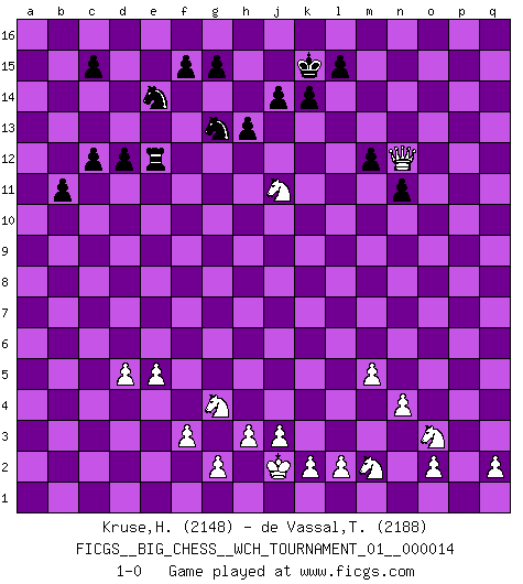 Last move : 1-0 2022 March 19 16:57:4 [Event "FICGS__BIG_CHESS__WCH_TOURNAMENT_01__000014"] [Site "FICGS"] [Date "2021.07.18"] [Round "1"] [White "Kruse,Herbert"] [Black "de Vassal,Thibault"] [Result "1-0"] [WhiteElo "2148"] [BlackElo "2188"] 1.j2-k4 h15-g13 2.h1-o7 m15-m13 3.m2-m4 j15-k13 4.l1-p5 h16-l13 5.d2-d4 k16-h15 6.b1-c3 p16-o14 7.e2-e4 l16-p12 8.c1-l9 e15-e13 9.n2-n4 l13-b4 10.c3-b5 b4-b2 11.f1-d3 b2-b4 12.o1-c12 j16-h16 13.e1-e3 b4-b2 14.e3-e1 b2-b4 15.e1-e3 b16-c14 16.e4-e5 f16-b12 17.a2-a3 b4-k12 18.d3-h7 d15-d14 19.g1-j2 c16-e14 20.c12-f9 e14-g12 21.p1-o3 g12-h13 22.o7-o10 g16-j15 23.l9-m10 k12-d12 24.p5-l9 q15-q13 25.l9-j7 d12-d5 26.o10-g3 e16-e14 27.h7-g8 d5-a8 28.e3-c3 n15-n14 29.f9-d11 a8-b8 30.c3-b3 e14-f14 31.b5-d6 b8-f12 32.f2-f3 f12-o4 33.g8-h9 o4-p4 34.h9-c14 b15-c14 35.b3-b12 p4-p2 36.k1-m2 e13-e12 37.q1-p1 p2-q3 38.d11-a14 g13-e14 39.a1-b1 j15-l14 40.a14-b15 c14-c13 41.p1-p3 q3-k9 42.b12-b9 k9-c2 43.b15-a16 h16-j15 44.a16-e12 h15-g13 45.e12-l6 o16-h10 46.m10-k8 h10-k8 47.j7-k8 m16-b16 48.j2-l3 b16-b14 49.p3-p9 c2-d3 50.g3-o10 m13-m12 51.o10-h4 d3-a3 52.j1-j2 a3-d3 53.h4-e4 d3-a6 54.b1-a1 a6-g12 55.p9-g9 g12-l12 56.m4-m5 l12-e6 57.m1-b1 f14-f8 58.k8-h10 p12-o13 59.e4-g4 e6-j10 60.h10-l13 k15-k14 61.g9-j9 f8-f10 62.j9-j10 f10-j10 63.b9-b14 a15-b14 64.l13-e7 o13-b1 65.a1-b1 j10-l10 66.l3-k5 o14-p12 67.l6-n8 l10-e10 68.n8-h13 e10-e7 69.h13-m9 p15-p14 70.b1-b7 e7-b7 71.d6-b7 o15-o13 72.k5-j7 n14-n13 73.j7-k9 q16-a16 74.g4-e6 n13-n12 75.e6-l6 a16-a7 76.l6-l14 a7-b7 77.l14-p14 q13-q12 78.m9-p12 o13-p12 79.p14-p12 n12-n11 80.p12-q12 b7-b9 81.k9-h8 b9-d9 82.q12-h4 d9-d12 83.k4-j6 b14-b13 84.h4-e4 b13-b12 85.d4-d5 d12-e12 86.h2-g4 d14-d13 87.h8-g10 c13-c12 88.j6-h8 b12-b11 89.h8-k9 d13-d12 90.k9-j11 k13-j11 91.g10-j11 h14-h13 92.e4-q15 j15-k15 93.q15-n12 1-0 Comment by player 1 : Herbert Kruse : Thanks, was difficult Follow this game move after move (download)Chess is the gymnasium of the mind. (Blaise Pascal) Kann Schach nicht schließlich das Nationalspiel der Deutschen werden? Und welche weiteren Ausblicke bieten sich dann dar! Welche Hebung des allgemeinen Kultur-Niveaus, ja der Moral, wenn das Schachbrett den Kartentisch verdrängen würde! Wahrlich, ein Ziel, des Schweißes der Edlen wert! (Siegbert Tarrasch) Aquellos que dicen entender al Ajedrez, no entienden nada. (Robert Hubner) Des idées, des idées, j'en ai cent, j'en ai mille. Des bonnes, des mauvaises, applicables, irréalisables... Il suffit de faire le tri ! (Roos) Who needs drugs and alcohol if he can play Big Chess at FICGS ? (Heinz-Georg Lehnhoff)